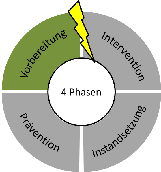 Neben der Präventionsphase ist auch die Phase der Vorbereitung auf eine Krise von hoher Bedeutung, denn die nachfolgenden Phasen (Intervention und Instandsetzung gelingen wesentlich besser, wenn im Vorfeld der Krise bereits Vorbereitungsmaßnahmen für den Ernstfall getroffen wurden.