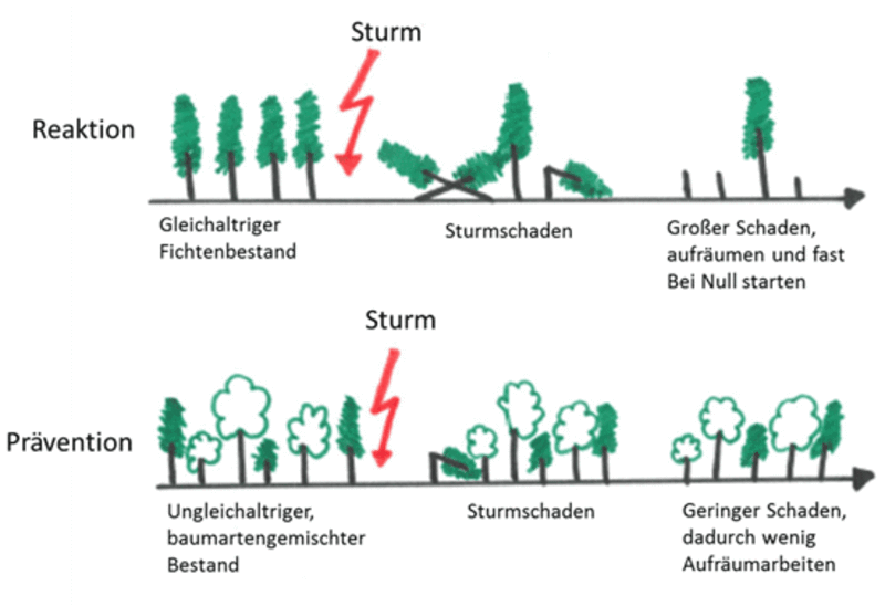 Abb. 1: Der Unterschied zwischen Prävention und Reaktion anhand von Sturmwurf. (FVA/Dännart)