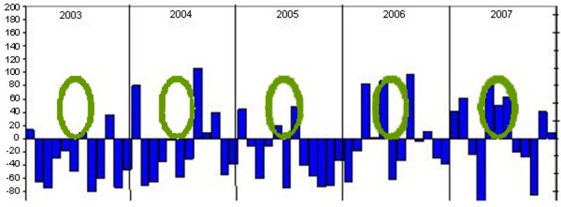 Abb. 3: Niederschlagsabweichung vom langjährigen Mittel; Station Freudenstadt (797 m ü. NN) 2003-2007. Die Ellipsen symbolisieren den Infektionszeitraum der Rußigen Douglasienschütte. Niederschlagsüberschuss in diesem Zeitraum bedeutet hohes Infektionsrisiko.