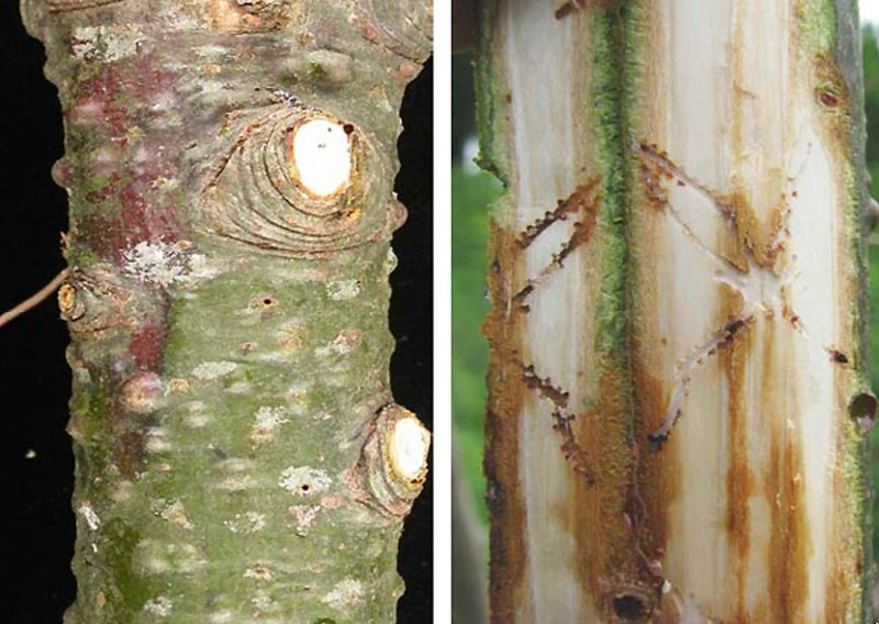 Abb. 5: Bohrlöcher und Brutbild des Furchenflügligen Fichtenborkenkäfers. (Foto: FVA)