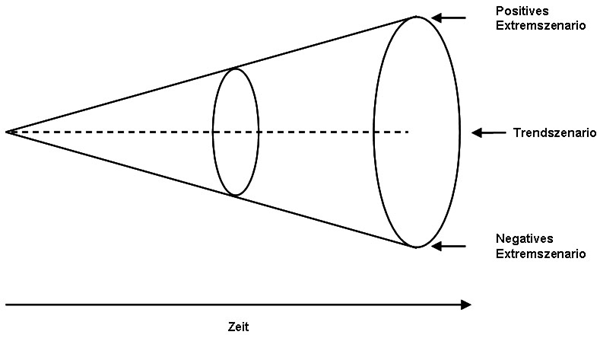 Mit dem Szenariotrichter werden drei Grundtypen von Szenarien abgebildet. Das Trendszenario schreibt den heutigen Stand in die Zukunft fort und berücksichtigt keine besonderen Einflüsse. Für die Szenariotechnik spielt es keine Rolle, weil sich dieses Szenario kaum von der Gegenwart unterscheidet. Vielmehr bedeutend sind die beiden Extremszenarien am Rande des Trichters. Die bestmögliche Entwicklung wird durch das positive (best case scenario), die schlechteste durch das negative Extremszenario (worst case scenario) beschrieben. Innerhalb dieser beiden Extremannahmen lassen sich alle denkbaren Zustände einordnen.