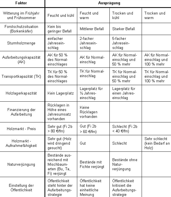Für einen Forstbetrieb kann man mehrere Krisen betrachten. Zu Beginn liegt der Fokus auf den Problemen mit der höchsten Eintrittswahrscheinlichkeit. Eine Auflistung der möglichen Krisen ist daher sinnvoll.