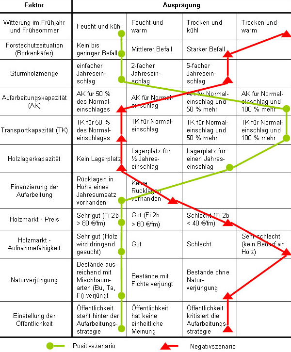 Für den Forstbetrieb Fichtengrün listeten die Beteiligten Einflussbereiche bzw. Einflussfaktoren mit ihren Ausprägungen auf (Tab. 1)