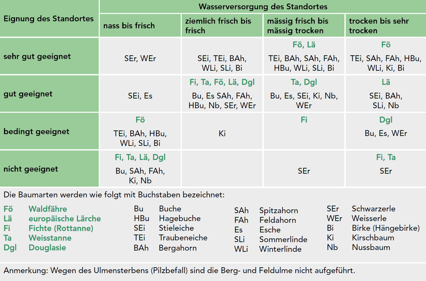 Andreas Roloff und Britt Grundmann, Institut für Forstbotanik und Forstzoologie der Technischen Universität Dreseden, haben 47 Baumarten aufgrund von 36 schriftlichen Arbeiten im Hinblick auf Trockenresistenz und Frosthärte bewertet. In der untenstehenden Tabelle sind davon zwanzig der wichtigsten Baumarten zusammengestellt. Sie sind vier unterschiedlich mit Wasser versorgten Standorten von nass bis sehr trocken zugeordnet. Die Wertung reicht von sehr gut geeignet bis nicht geeignet und gilt für Wälder in Tieflagen bis mittlere Berglagen.