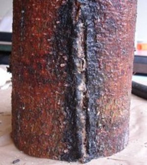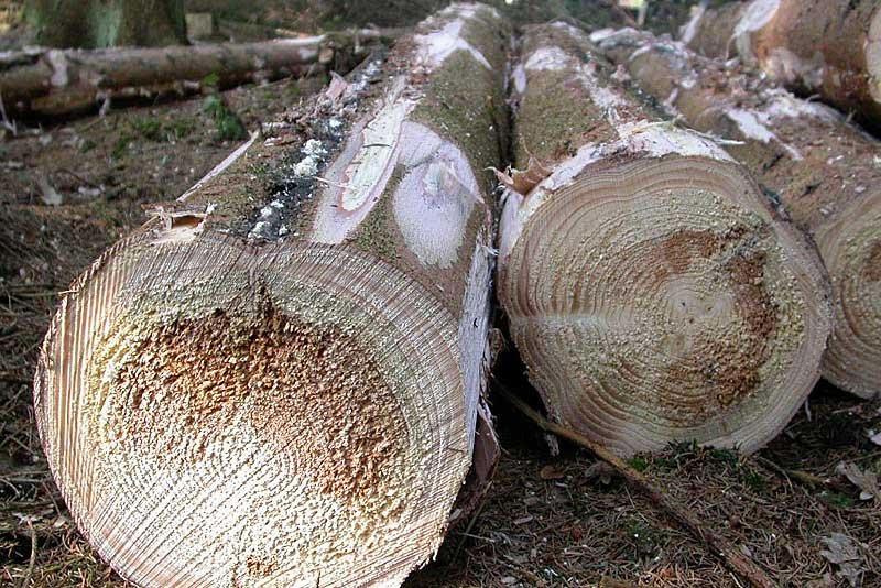 Eine Schlussfolgerung der Studie ist, dass die Zellwanddicke der Hauptgrund für den irreversiblen Kollaps von Zellen im Splintholz ist (Abbildungen 3-4). In weiterer Folge kann es zu sichtbaren Schaftrissen mit mehreren Metern Länge kommen (Abbildung 1). Die so geschwächten Fichten werden von Wundfäule befallen, was eine zusätzliche Wertminderung bedeutet (Abbildung 2).