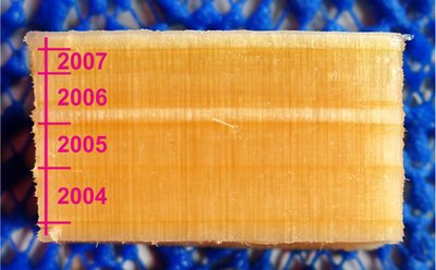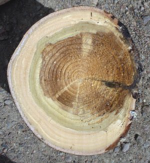Für die Diagnostik (Abbildung 5) ist es allerdings wichtig, dass diese bereits direkt im Feld, z.B. an frischen Bohrkernen, stattfindet, da die hellen Bänder an getrocknetem Holz nicht mehr auszumachen sind. Das Holz dieser Bänder hat im getrockneten Zustand (unter dem Fasersättigungspunkt) dieselbe Farbe wie das benachbarte Frühholz.