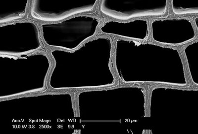 Abbildung 4. Die elektronenmikroskopische Aufnahme von Splintholz einer Fichte aus Südschweden zeigt kollabierte Zellen mit sehr dünnen welligen Zellwänden. Foto: Sabine Rosner/BOKU Wien
