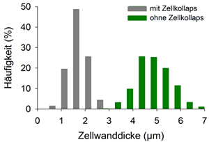 Abbildung 3. Das Balkendiagramm zeigt die prozentuale Verteilung der Zellwanddicke bei Bäumen mit Zellkollaps (grau) und Bäumen ohne Zellkollaps (grün). Das Diagramm basiert auf 22 Bäumen aus dem Klonarchiv von Skogforsk in Ekebo und 24 Bäumen aus Südnorwegen.
