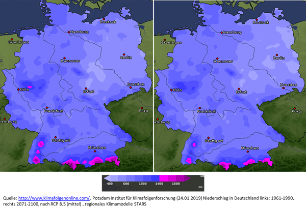 Das IPCC (Intergouvernemental Panel on Climate Change/ Weltklimarat) hat verschiedene Szenarien der weltweiten Klimaentwicklung bis zum Jahr 2100 definiert. Damit wird die Zunahme von Starkniederschlägen sowie häufigere und längere Trockenphasen vor allem in den Sommermonaten, in den mittleren Breitengraden als sehr wahrscheinlich eingestuft (SPM AR5, S.21). Die Niederschläge werden nach dem pessimistischen, aber realistischen Szenario RCP 8.5 in einem Band von Nordwesten bis Südosten Deutschlands im Durchschnitt leicht ansteigen, während vor allem in den heute schon trockenen Regionen im Osten Deutschlands sowie im Südwesten die Niederschläge in der Summe etwas abnehmen werden (s. Abb. 2).