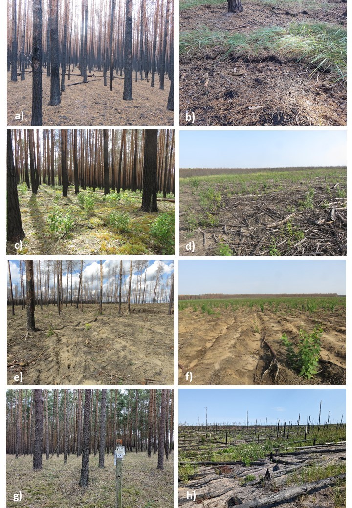 Abb. 1. Fotos aus den Untersuchungsgebieten des PYROPHOB-Projekts. a) Kiefernforst nach dem Waldbrand bei Treuenbrietzen (19.11.2018): die gesamte Vegetation ist verbrannt, Asche und Kiefernnadeln der abgestorbenen Bäume bedecken den Boden. b) Rand des Brandes: die Humusauflage ist fast vollständig verbrannt (Jüterbog, 22.10.2019). Forstliche Behandlungsvarianten nach dem Brand im Gebiet Treuenbrietzen (mit Naturverjüngung der Zitterpappel): c) kein Management (01.05.2019), d) vollständige Beräumung (30.08.2019), e) Auflichtung, Bodenbearbeitung und Eichen-Pflanzung (01.05.2020), f) Kahlschlag, Pflügen und Kiefern-Pflanzung (30.08.2019). g) unverbrannte Referenzfläche (Plot L6) (20.07.2023). h) Fläche B (kein Management) nach dem zweiten Waldbrand in 2022; ein Teil des Totholzes ist nicht verbrannt und die Zitter-Pappeln treiben mittels Wurzelbrut bereits wieder aus. Fotos: a-f: Thilo Heinken, g-h: Maren Schüle (UP)