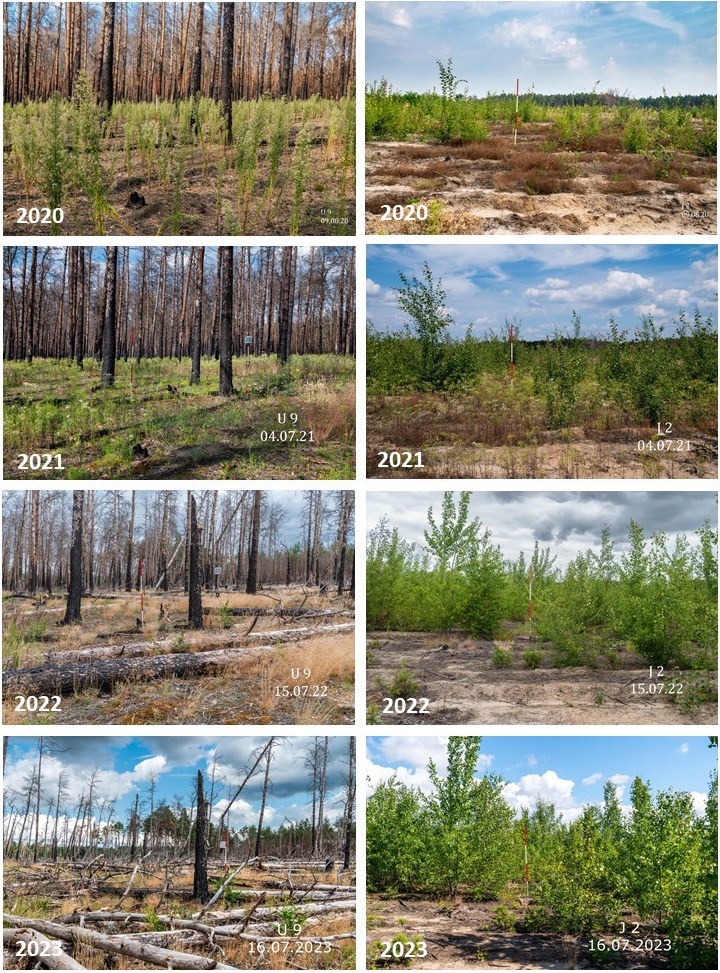 Abb. 2. Vegetationsentwicklung auf Untersuchungsflächen des PYROPHOB-Projekts; Beispielflächen im wissenschaftlichen Fotomonitoring aus der gleichen Perspektive im Zeitverlauf (2020-2023) aufgenommen. Links: Plot U7, Jüterbog (kein forstliches Management): Die verbrannten Wald-Kiefern fallen innerhalb weniger Jahre vollständig zu Boden und tragen zur Strukturvielfalt auf den Flächen bei; die Verjüngung von Laubbäumen ist in diesem Untersuchungsgebiet deutlich geringer als in Treuenbrietzen. Rechts: Plot J2 Treuenbrietzen (Kahlschlag, Pflügen, Kiefernpflanzung) mit sehr starkem Aufwuchs der Zitter-Pappel (Populus tremula). Foto: Tilo Geisel