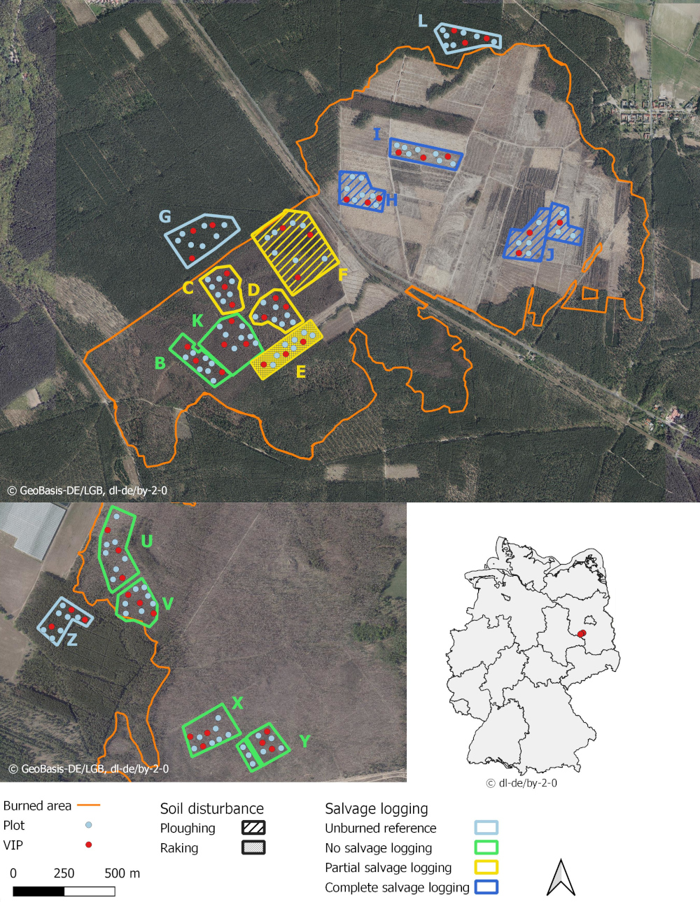 Abb. 4. Lage des PYROPHOB-Projekts in Deutschland und Karte der Untersuchungsflächen mit den einzelnen Plots und VIPs in den Untersuchungsgebieten a) Treuenbrietzen (TB) und b) Jüterbog (JB) auf der Grundlage von Luftbildern von 2019 (TB) und 2022 (JB). Forstliche Maßnahmen auf den Untersuchungsflächen sind durch verschiedene Farben (Beräumung) bzw. Muster (Bodenbearbeitung) dargestellt. Die Untersuchungsflächen C-J und U, V, Z wurden im Juli 2020 eingerichtet, wobei die Flächen C-G nur bis Juni 2022 untersucht wurden. Die Flächen B, K, X und Y wurden im April 2021 eingerichtet, wobei die Flächen B und K nur bis Juni 2022 untersucht wurden. Fläche L wurde als Ersatz für die abgebrannte Referenzfläche G im Herbst 2022 eingerichtet. Foto: T. Heinken (UP)