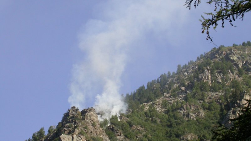 Abb. 1 - Typische Rauchkolonne eines Blitzschlagbrandes im Hochgebirge. Foto: G. Cesti, Aostatal