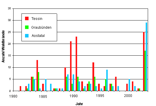 Abb. 2 - Jährliche Anzahl registrierter Blitzschlagbrände im Tessin, in Graubünden und im Aostatal (Periode 1980–2003)