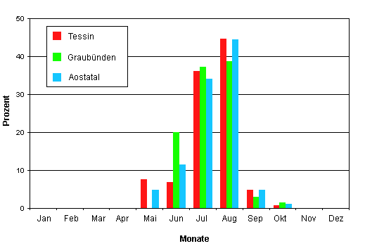Blitzschlagbrände treten vor allem während des Sommerhalbjahres auf, wobei im Juli und August die meisten Feuer entstehen (Abb. 3). In diesen Monaten machen die Blitze 20 bis 40% aller Waldbrände aus: In der Periode 1994 bis 2003 waren es ca. 39% im Tessin, ca. 35% in Graubünden und ca. 20% im italienischen Aostatal.