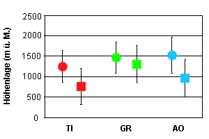 Abb. 4 - Verteilung der Waldbrände imSommerhalbjahr (Mai-Oktober) nach Höhenlage im Tessin, in Graubünden und im Aostatal (Periode 1980–2003). Kreise: Blitzschlagbrände; Quadrate: vom Mensch verursachte Brände; Striche: Standardabweichung.