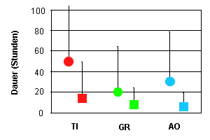 Abb. 5 - Verteilung der Waldbrände imSommerhalbjahr (Mai-Oktober) nach Dauer im Tessin, in Graubünden und im Aostatal (Periode 1980–2003). Kreise: Blitzschlagbrände; Quadrate: vom Mensch verursachte Brände; Striche: Standardabweichung.