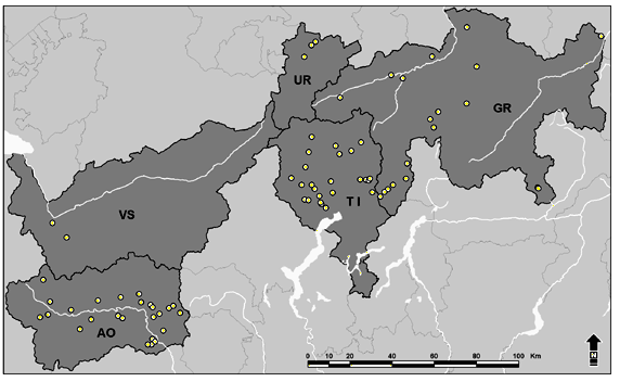 Abb. 6 - Startpunkte der im Sommer 2003 durch Blitzschlag verursachten Waldbrände.