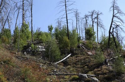 Abb. 1. Waldbrandfläche bei Leuk: Pioniergehölze wie Pappel, Birke und Weide bilden bereits einen Buchschwald. Foto: Thomas Wohlgemuth (WSL)