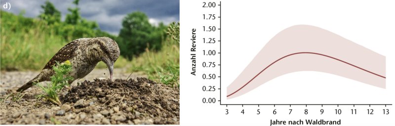 Übereinstimmend mit anderen Studien zeigen die vorliegenden Daten, dass viele Vögel, die eine Vorliebe für offene und halboffene Landschaften zeigen, von Waldbränden profitieren. Dies schliesst insbesondere Arten ein, die in der Schweiz auf der Roten Liste zu finden sind oder als Prioritätsarten gelten wie Steinhuhn, Wendehals oder Gartenrotschwanz, oder in den letzten Jahren Bestandesrückgänge zu verzeichnen hatten wie der Baumpieper.