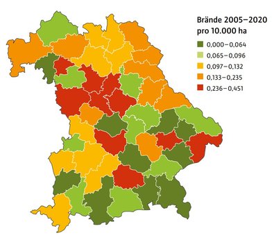 Insgesamt umfasst die Waldbrandfläche über alle Besitzarten im Mittel 0,02 ‰ der Waldfläche Bayerns – faktisch ist Waldbrand derzeit gegenüber den anderen abiotischen Schadensursachen wie Sturmwurf damit nur eine sehr geringe Schadensquelle. Schon 2009 wurde festgestellt, dass die Waldbrände in Bayern aufgrund ihrer niedrigen Anzahl und ihres geringen Flächenanteils nur eine untergeordnete Rolle für den Waldschutz spielen.