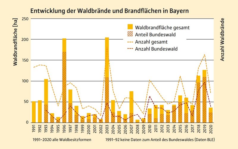 Ebenso sichtbar wird der Einfluss der Witterung in den Extremjahren 2018 und 2019 mit Brandflächen über 100 Hektar. Der Flächenanteil im Bundeswald beträgt im Mittel 53 % der gesamten Brandfläche über alle Waldbesitzformen. Hinsichtlich ihrer Häufigkeit finden damit im Mittel 38 % der Waldbrände auf 2 % der Waldfläche in Bayern statt. Da ein Großteil des Bundeswaldes militärisch genutzt wird, beispielsweise an den großen Übungsplätzen Grafenwöhr und Hohenfels, ist hier die Waldbrandursache "sonstige handlungsbedingte Einwirkungen" von besonderer Bedeutung. Bei dieser Brandursache wird davon ausgegangen, dass der Brand durch bekannte Einwirkung und nicht durch Fahrlässigkeit ausgelöst wurde (z. B. durch Entzündung von Munition).