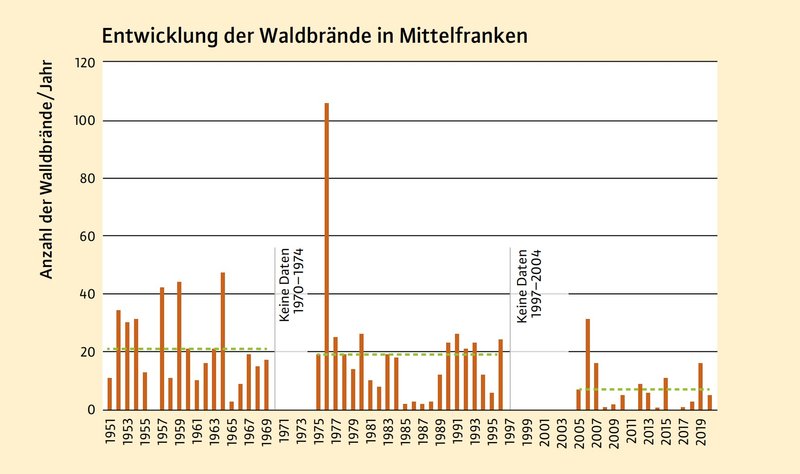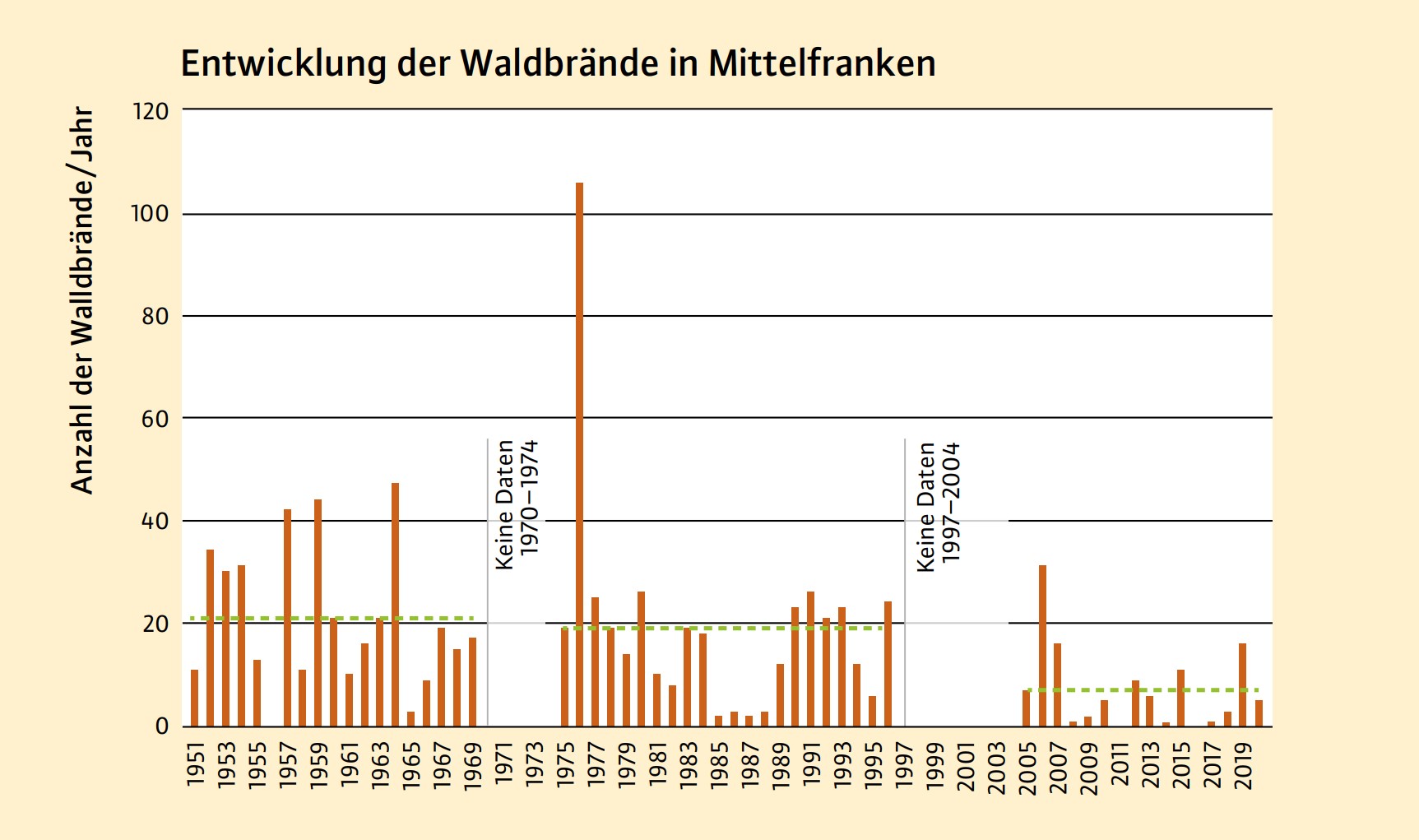 Die Mittelwerte der drei betrachteten Perioden (1951-1969, 1975-1996, 2005-2020), zwischen denen längere Zeitabschnitte mit Datenausfall liegen, zeigen für die jüngste Periode eine Abnahme der Waldbrände um mehr als die Hälfte im Vergleich zu den beiden Vorperioden. Trotz der höheren Lufttemperaturen und langen Trockenperioden als Folge des seit Beginn der 1990er Jahre zunehmenden Klimawandels sind für die Entstehung von Waldbränden offensichtlich noch andere Faktoren verantwortlich.
