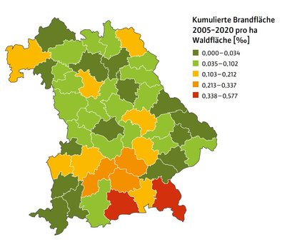 Für die räumliche Verteilung der aufgetretenen Waldbrände wurden die Meldungen der ÄELF (ohne Bundeswald) an das StMELF für die Jahre 2005–2020 herangezogen. Die Anzahl der Brände sowie die Waldbrandfläche wurden dabei auf die Waldfläche der ÄELF normiert (Abbildung 5).