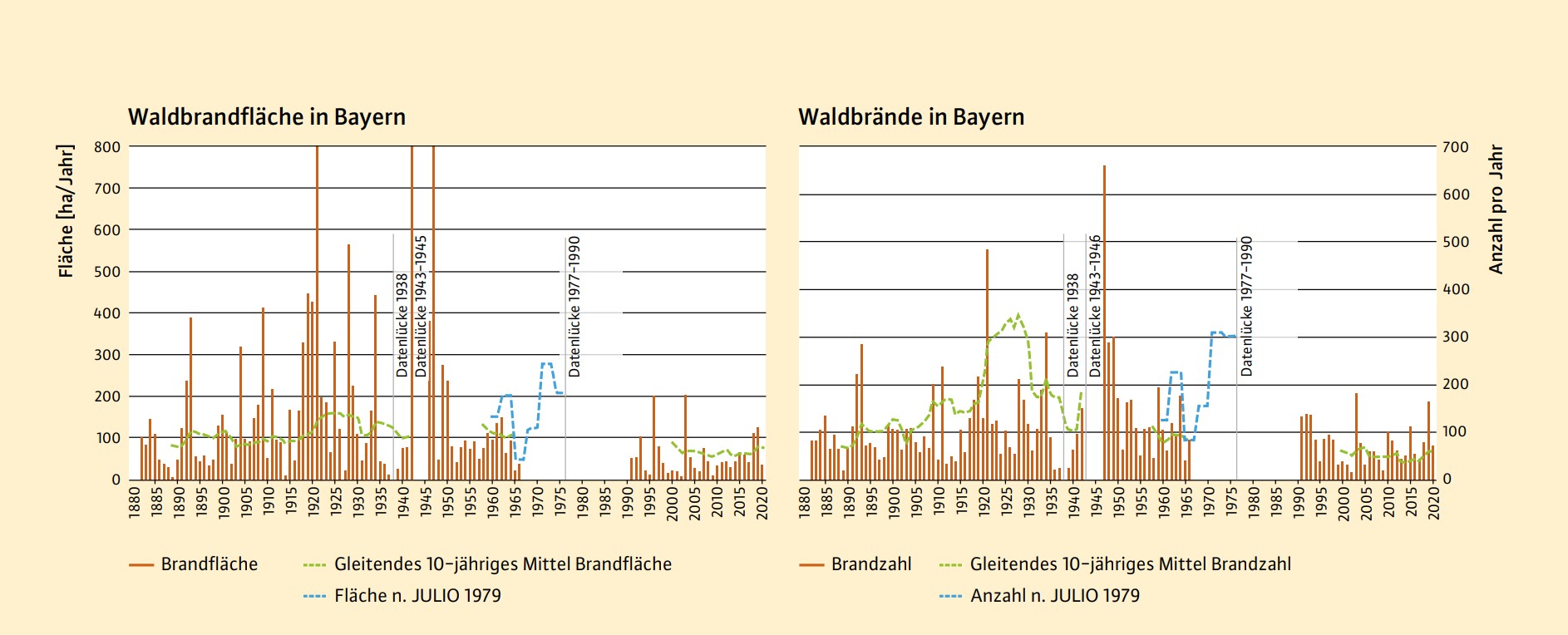 In Bayern spielt Waldbrand bei den abiotischen Waldschäden derzeit mit durchschnittlich 77 Waldbränden und einer mittleren Brandfläche von 57 ha im Jahr (0,02 ‰ der Waldfläche) eine untergeordnete Rolle. Ein regionaler Schwerpunkt liegt in den kiefernreichen Waldbeständen Mittelfrankens und der Oberpfalz, größere Brandflächen entstehen im schwierigen alpinen Gelände. Im Vergleich zu früheren Zeiten ist die Waldbrandhäufigkeit gesunken, obwohl das klimatische Waldbrandrisiko in den letzten Jahrzehnten durch den Klimawandel gestiegen ist. Andere Faktoren, wie eine schnelle Alarmierung und Bekämpfung, ein hoher Erschließungsgrad im Wald, der Waldumbau hin zu laubwaldreicheren Mischwäldern mit anderer Bodenvegetation sowie geändertes gesellschaftliches Verhalten sorgen bisher für niedrige Waldbrandzahlen. Es besteht jedoch kein Anlass zur Entwarnung, da die prognostizierte klimatische Entwicklung in die andere Richtung weist. Abbildung 9 macht deutlich, dass das Thema weiterhin unserer besonderen Aufmerksamkeit bedarf.
