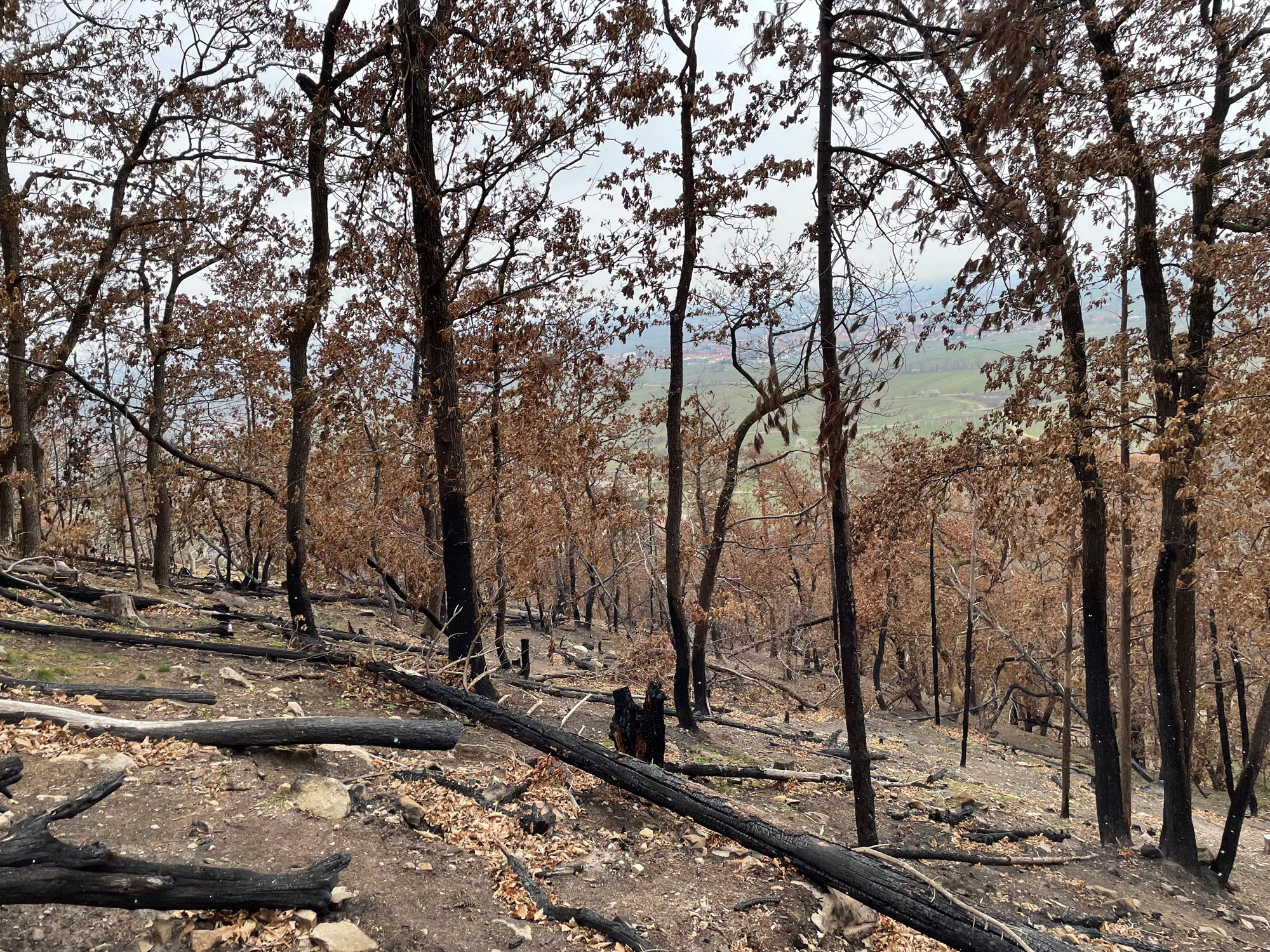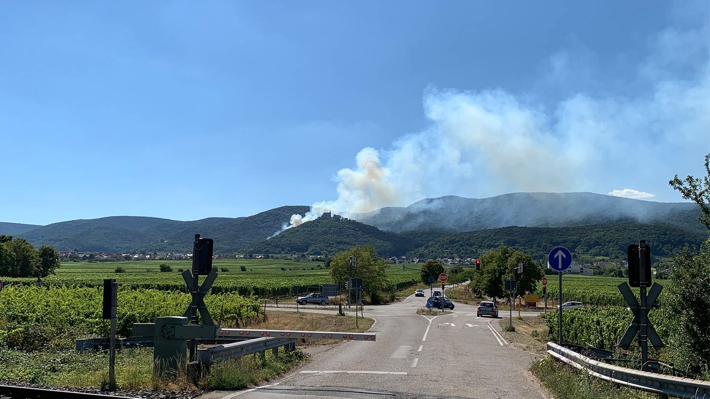 Die Lufttemperatur lag um 15 Uhr (Zeitpunkt des Ausbruchs) bei 34,1 °C, während die Luftfeuchte lediglich 23% betrug. Hinzu kam ein Südostwind, der mit Geschwindigkeiten zwischen 10 und 20 km/h die Luft aus der Rheinebene in Richtung Haardtrand trug [7]. Ein Abgleich dieser Wetterverhältnisse mit dem aus der 30er-Regel bekannten idealen Waldbrandwetter (Lufttemperatur > 30 °C, Luftfeuchte < 30 %, Windgeschwindigkeit > 30 km/h, Hangneigung > 30° und dadurch Kamineffekt) zeigt auch hier die günstigen Bedingungen für die Entstehung und Ausbreitung des Brandes [8]. Hinzu kommen die Windrichtung aus Südost, die Südexposition der Hangfläche, die lichte Waldstruktur und die schlechte Wasserversorgung des Standorts [9, 10].