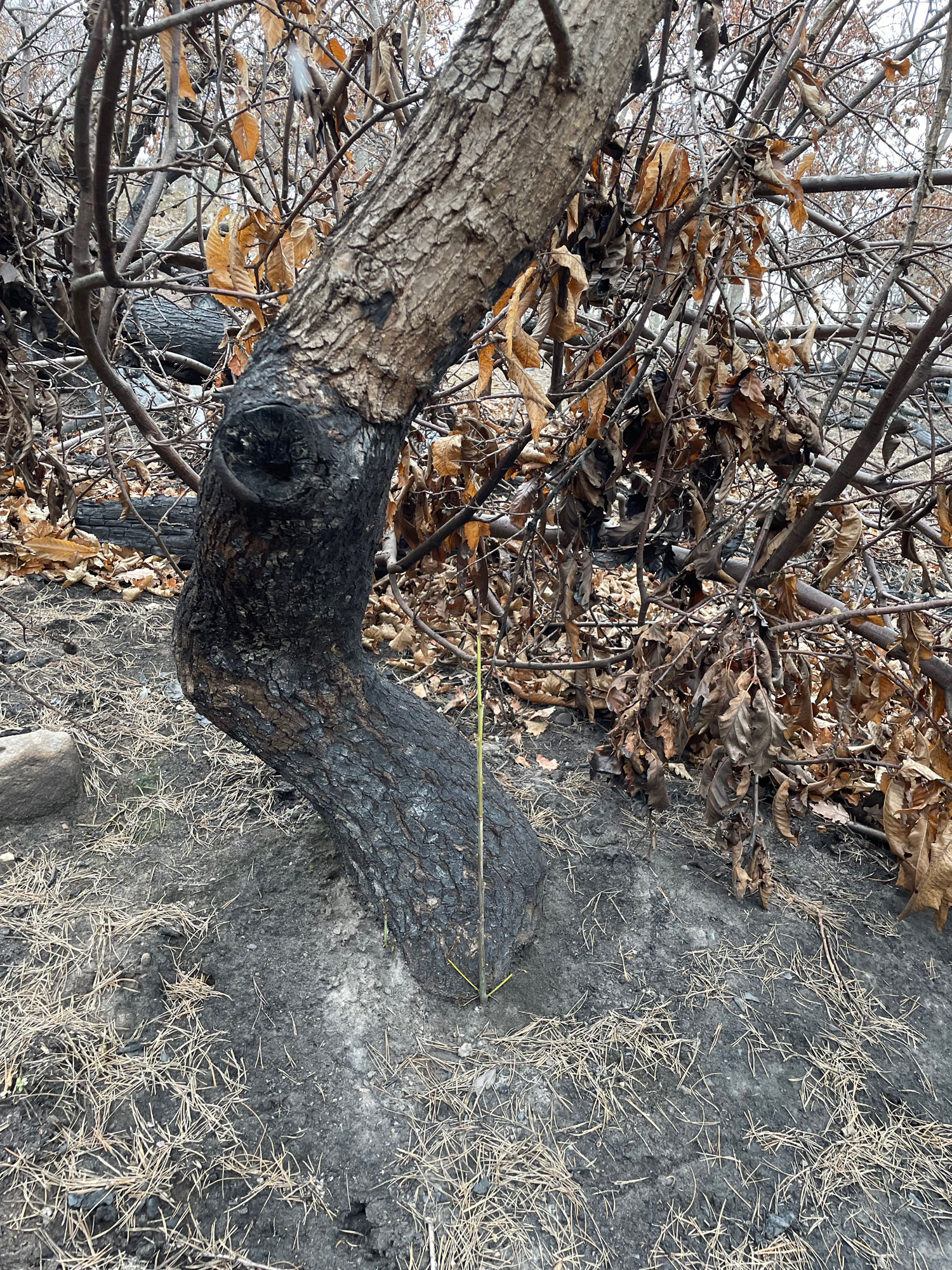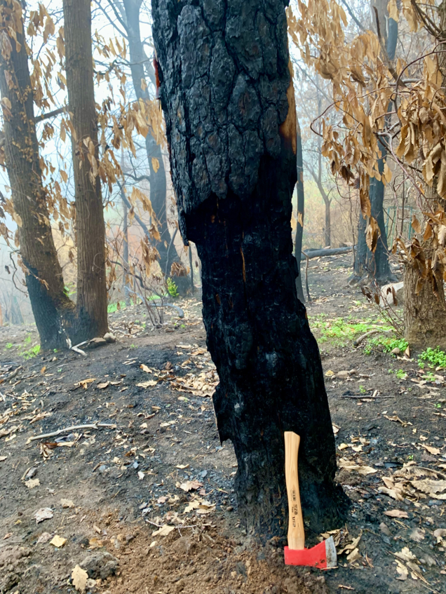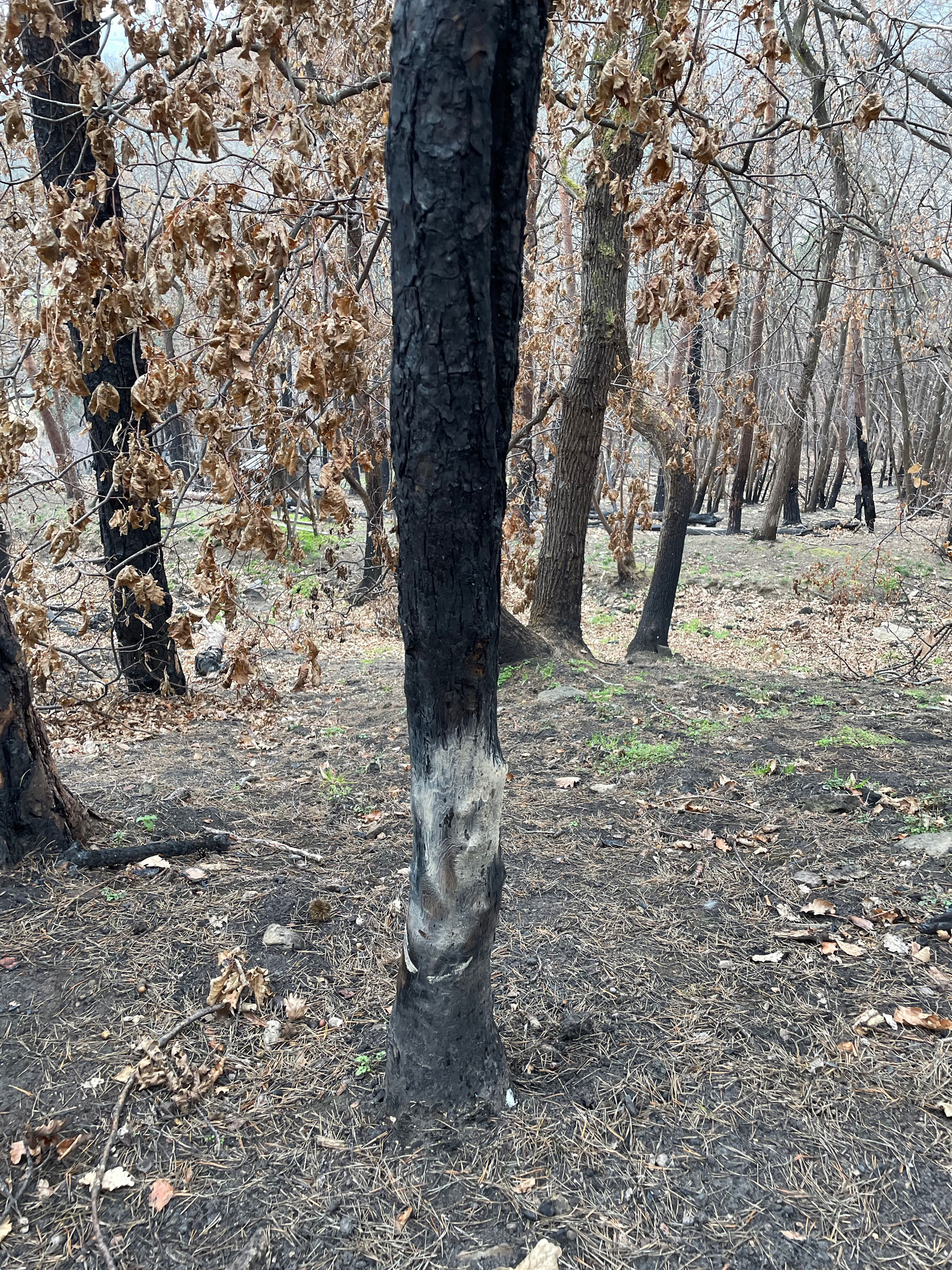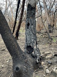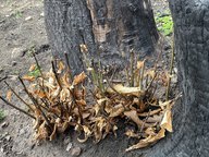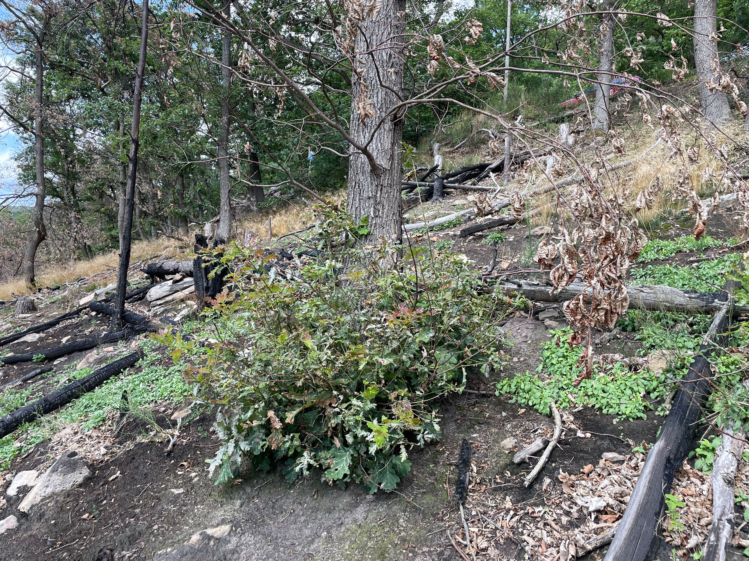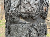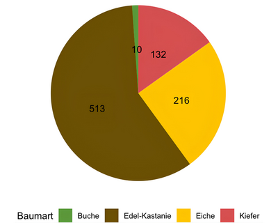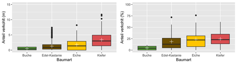 Zunächst zeigt die Auswertung der Verkohlungshöhen und -anteile der verschiedenen Baumarten eine besonders geringe Schädigung der Buche, gefolgt von der Edelkastanie, dann der Eiche und zuletzt der am stärksten betroffenen Kiefer (Abb. 7, 8). Vergleicht man dieses Ergebnis mit der Auswertung des Austriebs, gibt es erwartungsgemäß entsprechend wenig überlebende Kiefern. Allerdings fällt auch auf, dass trotz vermeintlich geringer Schädigung keine Buchen überlebten. Diese Beobachtung lässt sich vermutlich auf die dünne Rinde der Buche zurückzuführen, durch die das Kambium schon bei starker Sonneneinstrahlung Schaden nehmen kann. Bessere Überlebensraten zeigten die Traubeneichen (25%) und die Edelkastanien (57%). Bei beiden Baumarten besteht der Neuaustrieb überwiegend aus Stockausschlägen.