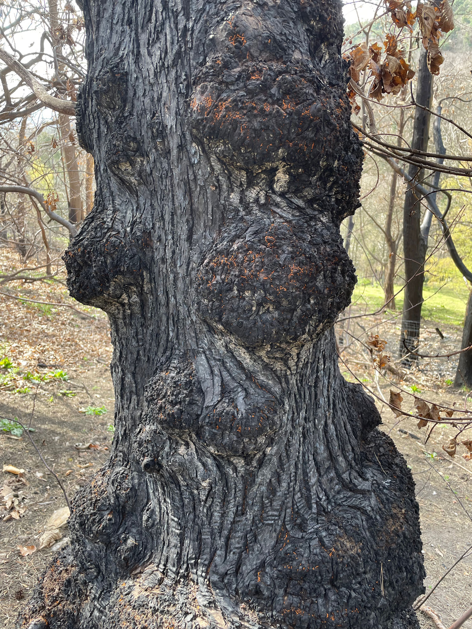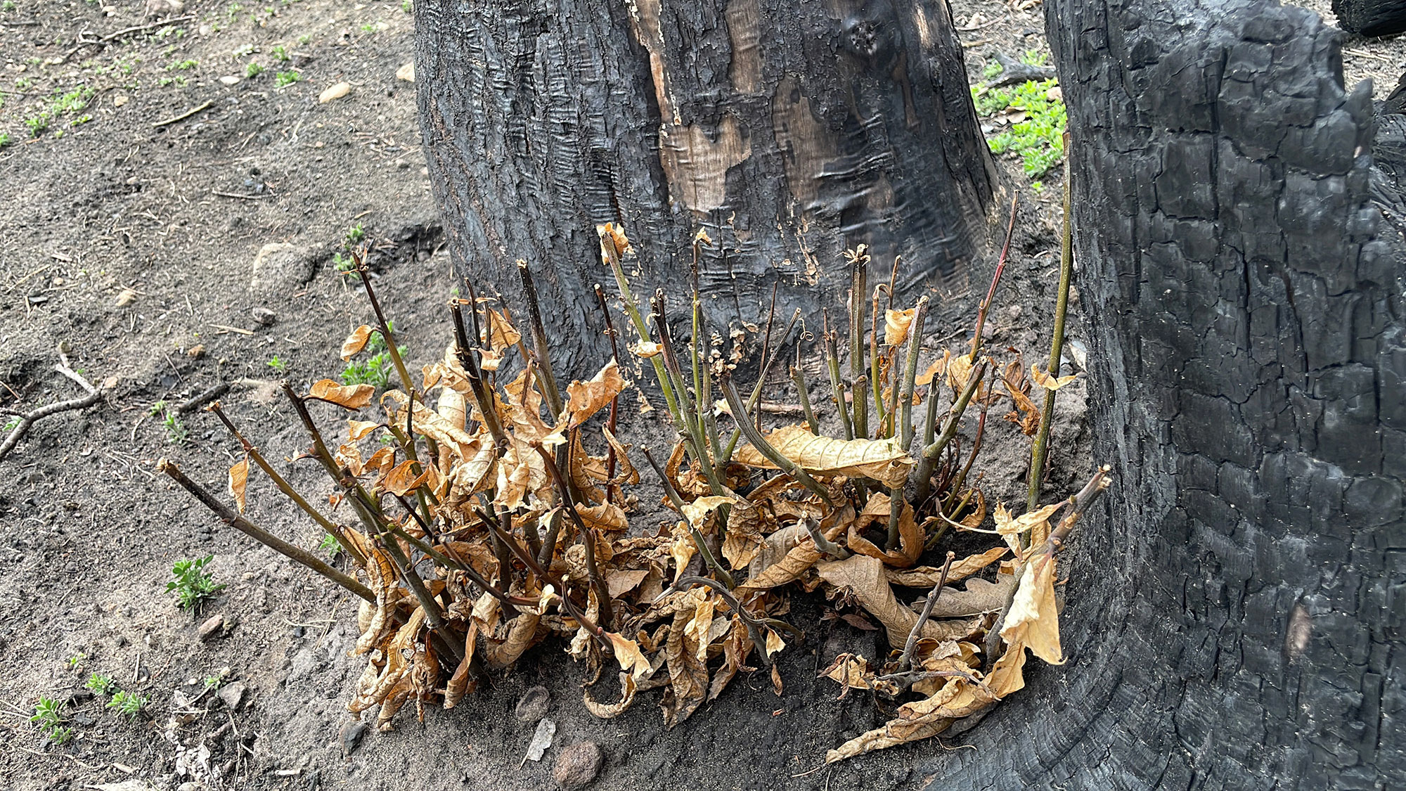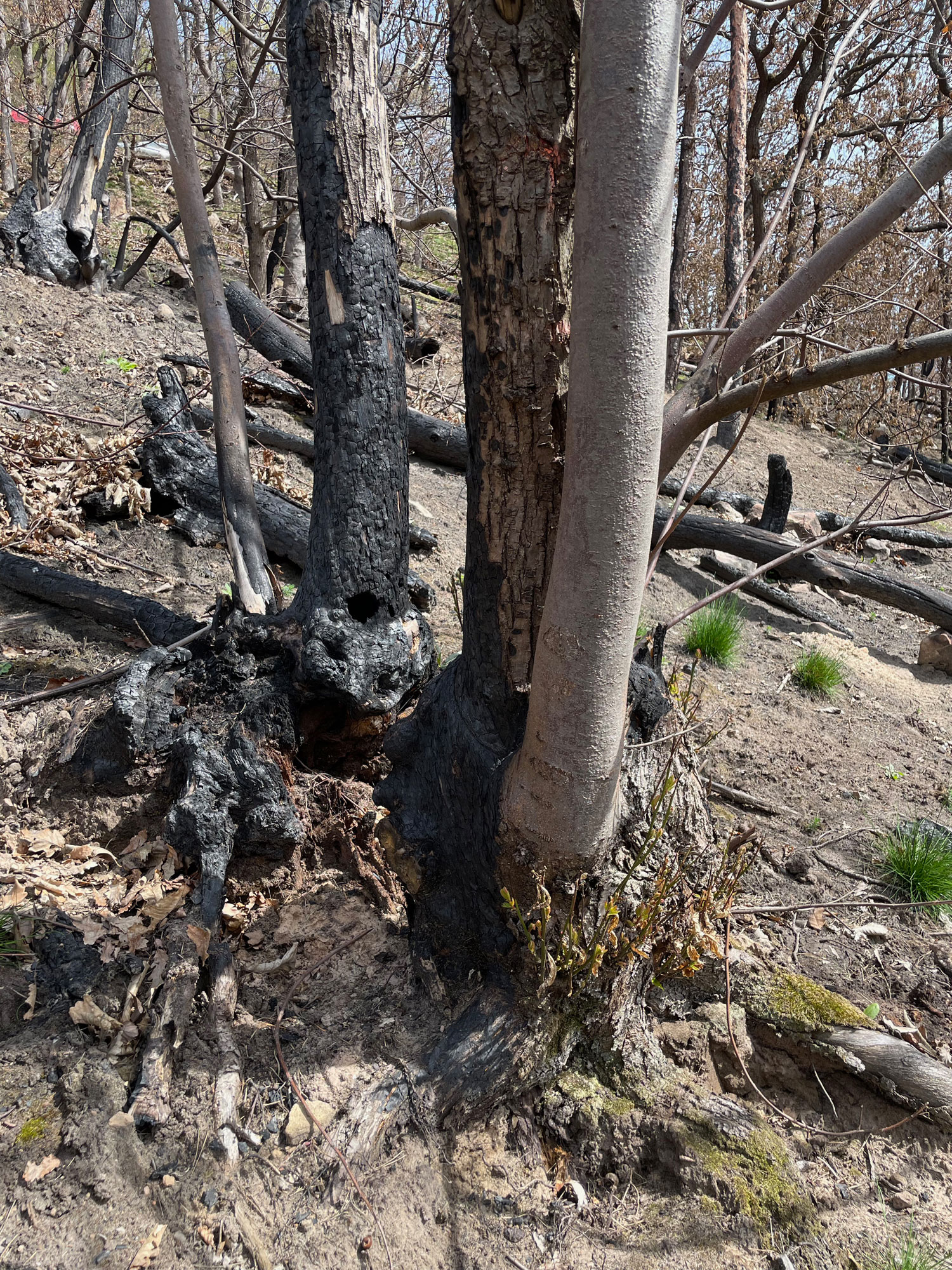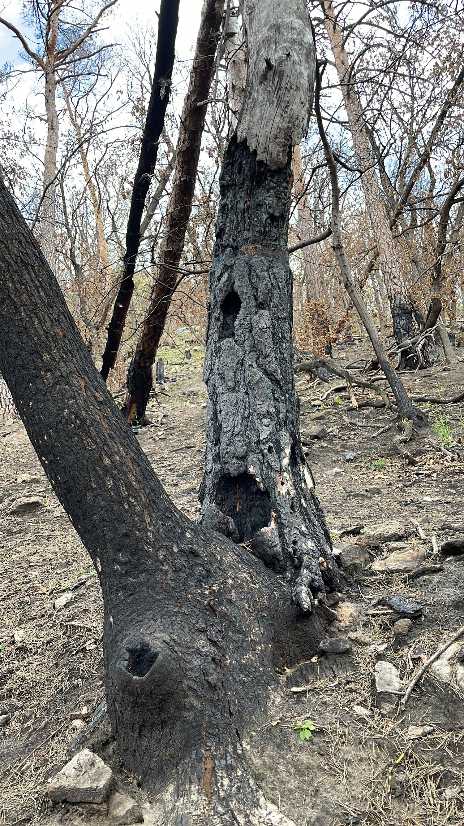 Zunächst zeigt die Auswertung der Verkohlungshöhen und -anteile der verschiedenen Baumarten eine besonders geringe Schädigung der Buche, gefolgt von der Edelkastanie, dann der Eiche und zuletzt der am stärksten betroffenen Kiefer (Abb. 7, 8). Vergleicht man dieses Ergebnis mit der Auswertung des Austriebs, gibt es erwartungsgemäß entsprechend wenig überlebende Kiefern. Allerdings fällt auch auf, dass trotz vermeintlich geringer Schädigung keine Buchen überlebten. Diese Beobachtung lässt sich vermutlich auf die dünne Rinde der Buche zurückzuführen, durch die das Kambium schon bei starker Sonneneinstrahlung Schaden nehmen kann. Bessere Überlebensraten zeigten die Traubeneichen (25%) und die Edelkastanien (57%). Bei beiden Baumarten besteht der Neuaustrieb überwiegend aus Stockausschlägen.