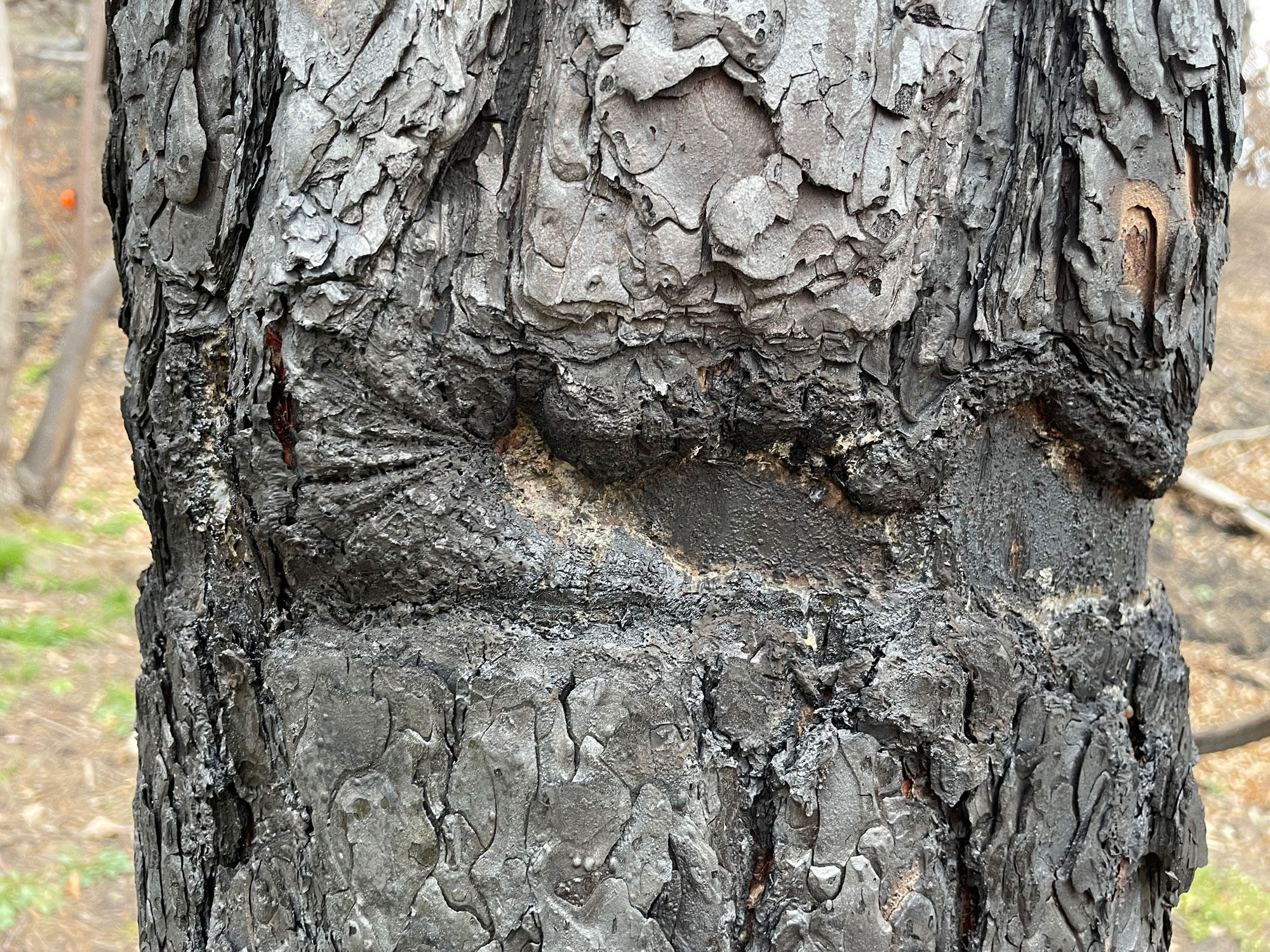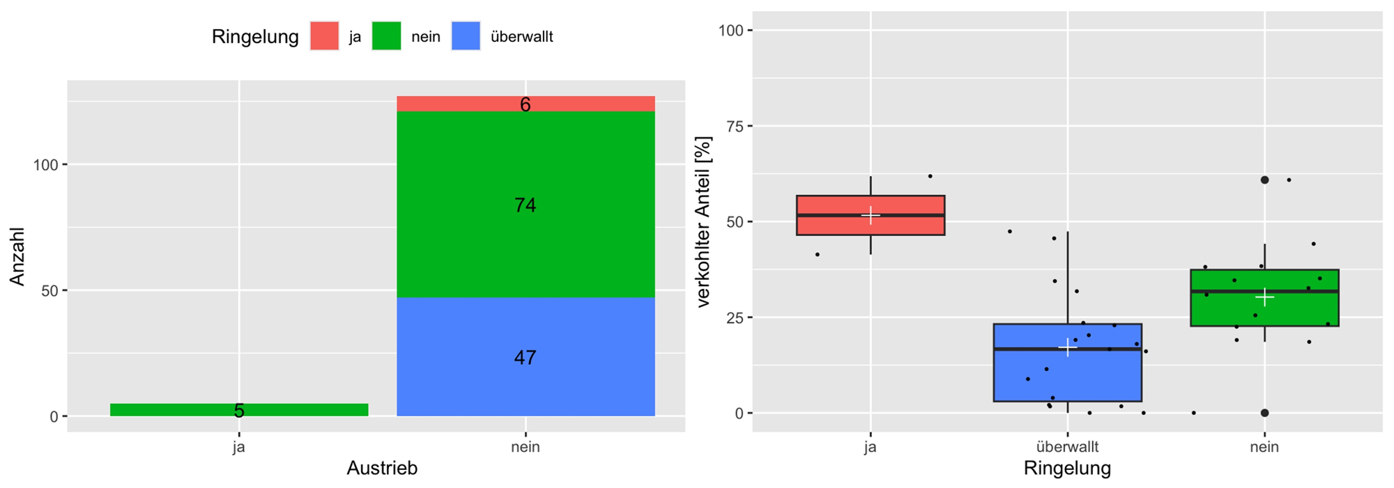 Die Auswertung der Ringelung zeigte, dass von 132 Kiefern lediglich fünf ungeringelte Exemplare den Brand überlebten und dass die vollständig geringelten Kiefern am höchsten verkohlten. Jedoch verkohlten wider Erwarten die nicht geringelten Kiefern stärker als jene, die den Schaden überwallen konnten (Abb. 9).