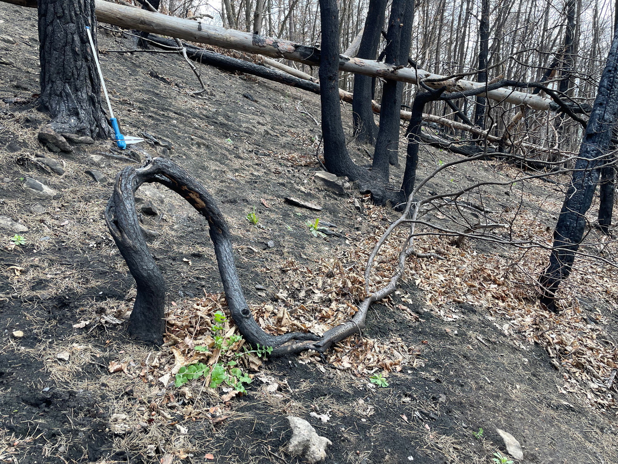 Aufgrund der Siedlungs- und Wegenähe des Brandherds ist weiterhin von einem menschlichen Verschulden als Ursache des Waldbrands auszugehen. Die Hitze und die trockene Witterung haben seine Entstehung und Ausbreitung begünstigt. Die Frage nach einer Schädigung des Bestandes ist zu bejahen. Lediglich 40% der Bäume konnten den Brand überleben. Besonders betroffen wurden dünnborkige Bäume. Stockausschlagfähige Baumarten zeigten eine signifikant höhere Fähigkeit zur Kompensation der Schädigung, indem sie nach dem Ausfall neu austreiben konnten. Von 132 Kiefern überlebten lediglich fünf ungeringelte Exemplare den Brand. Auch die Frage nach einem ökonomischen Schaden ist mit Ja zu beantworten. Es gingen nicht nur fast 28.000 € Waldwert verloren, sondern zur Löschung des Brandes entstanden geschätzte Kosten im sechsstelligen Bereich.