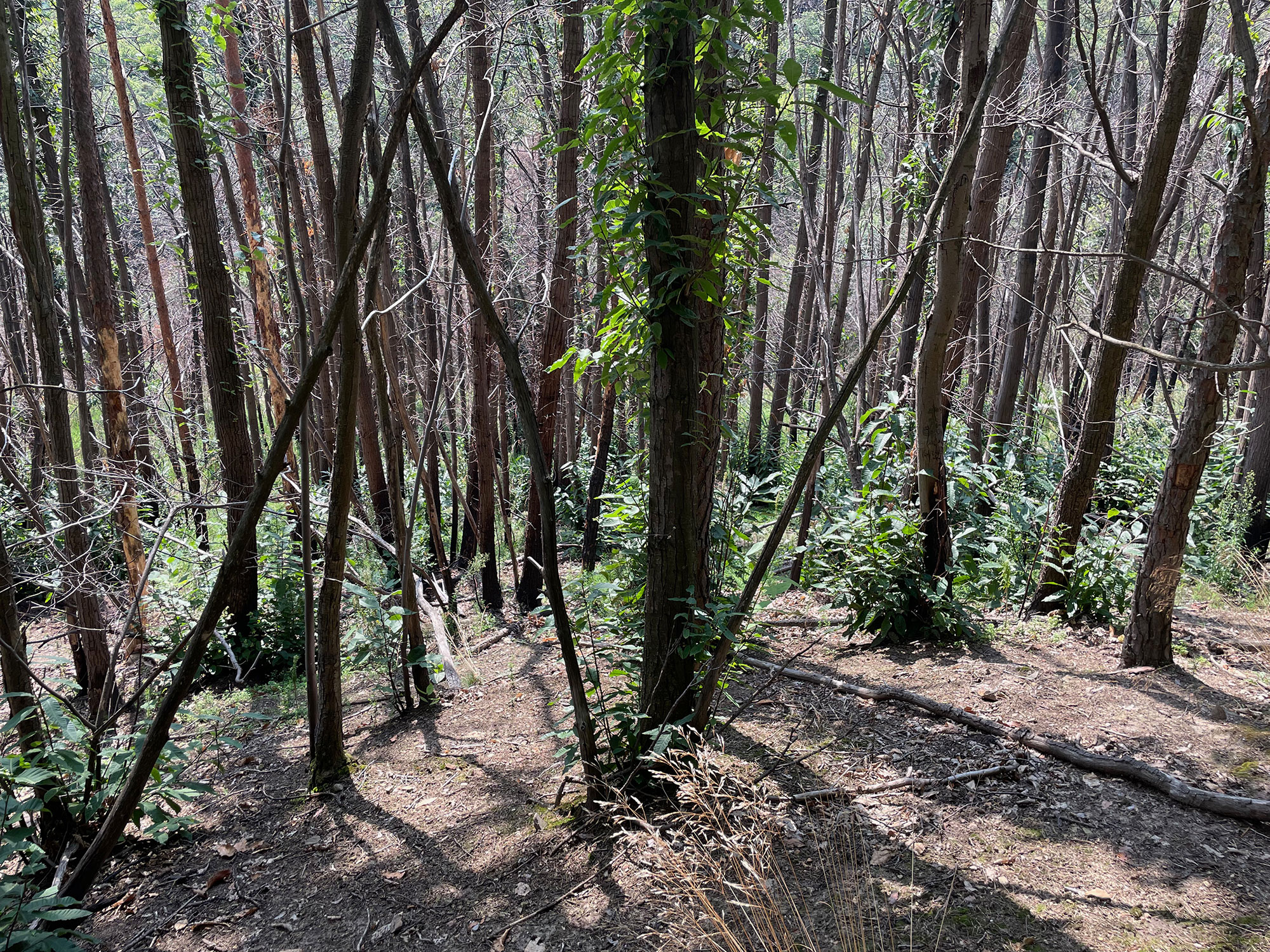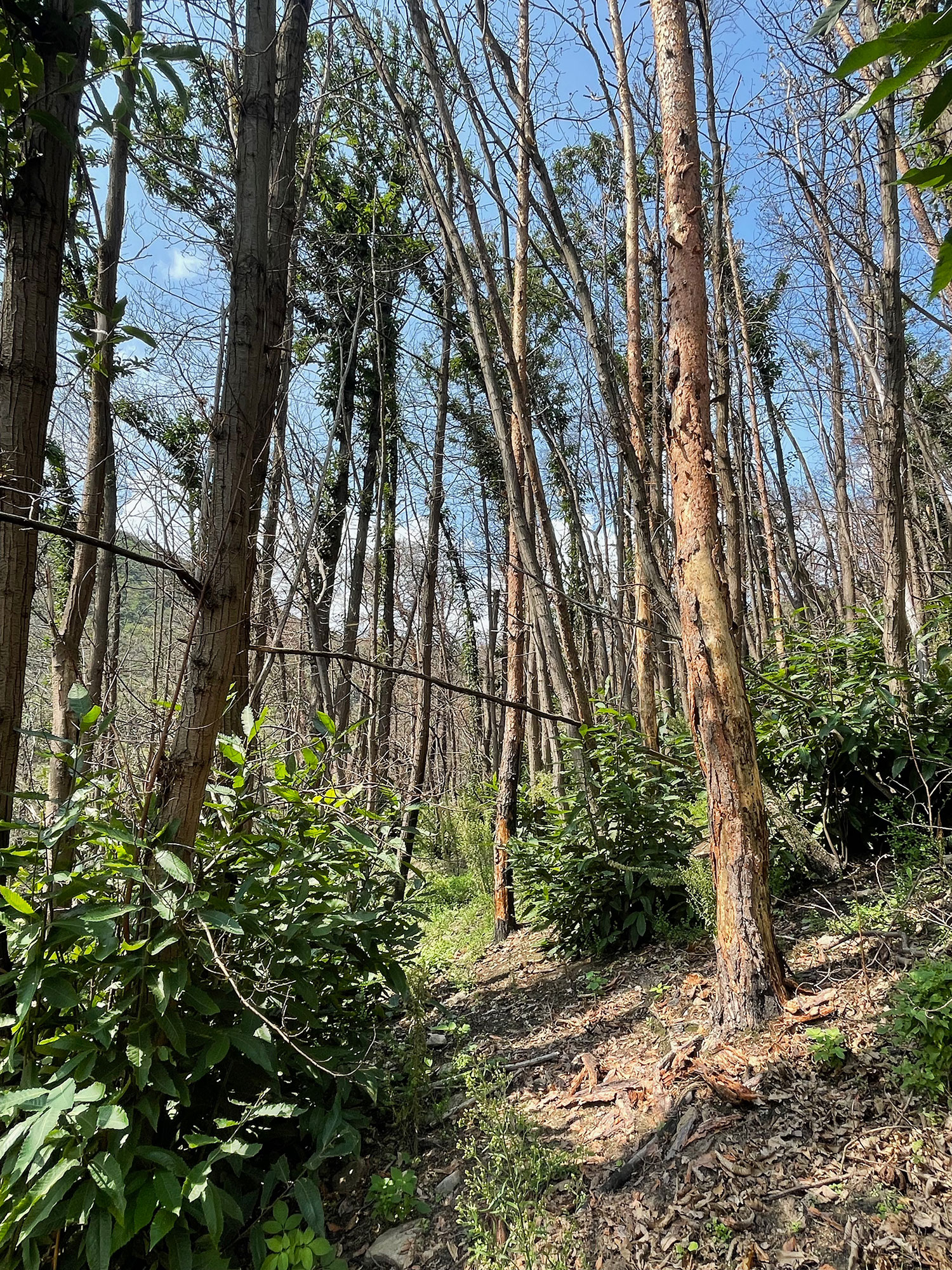 Das Waldgebiet selbst gliedert sich in 1,6 ha Hochwald und 0,2 ha Niederwald. Der Hochwald besteht aus einem zweischichtigen, lichten Traubeneichen-Mischwald, in dem Kiefer im Alter von 97 Jahren und Edelkastanie im Oberstand dominieren und Edelkastanie sowie Traubeneiche flächig im Unterstand beigemischt sind, ergänzt durch einzelne Rotbuchen. Die Niederwaldfläche ist zu 99 % mit dichten Edelkastanien-Stockausschlägen und vereinzelt beigemischter Waldkiefer und Traubeneiche im Stangenholzalter bestockt (Abb. 2).