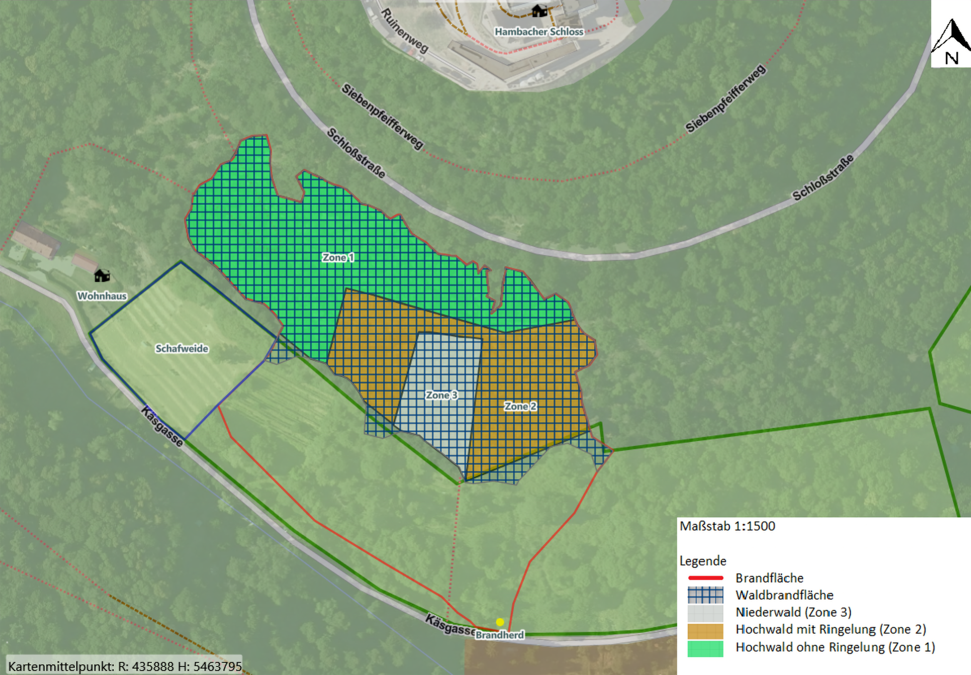 Die Brandfläche befindet sich am Ostrand des Pfälzerwaldes, dem Haardtrand, und erstreckt sich zwischen der aus der Ortschaft Diedesfeld kommenden Käsgasse und der zum Hambacher Schloss führenden Schlossstraße. Das Gelände ist steil, teilweise terrassiert und nach Süden exponiert. Aufgrund des hoch anstehenden Buntsandsteins handelt es sich um einen trockenen und nährstoffarmen Standort. Das vom Brand betroffene Areal umfasst insgesamt 2,8 Hektar, von denen jedoch nur die 1,8 Hektar mit Waldbestand untersucht wurden. Die restliche Fläche besteht aus ehemaligen Garten- und Weinbergsgrundstücken.