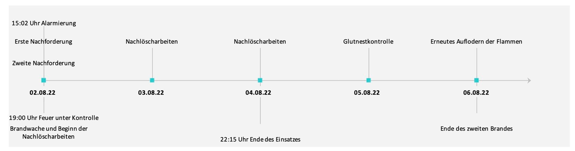Die Meldung des zunächst tischtennisplattengroßen Brandherds erfolgte am 3. August 2022 kurz vor 15 Uhr durch eine Anwohnerin, die Rauch bemerkt hatte. Bei Eintreffen der örtlichen Feuerwehr hatte sich das Feuer bereits auf eine Fläche von schätzungsweise 1,6 ha ausgedehnt und drohte die Zufahrtsstraße zum Hambacher Schloss zu überspringen. Es folgten mehrere Nachalarmierungen benachbarter Feuerwehren und anderer Katastrophenschutzeinheiten sowie mehrtägige Nachlöscharbeiten, bis der Brand am Abend des 4. Augusts nach einer Beteiligung von über 200 Einsatzkräften erfolgreich bekämpft war. Am 5. August erfolgten weitere Brandkontrollen und am 6. August kam es zu einem erneuten Auflodern der Flammen, das jedoch nach wenigen Stunden gelöscht werden konnte [3]. Somit dauerte der Brandeinsatz insgesamt fünf Tage (Abb. 5).