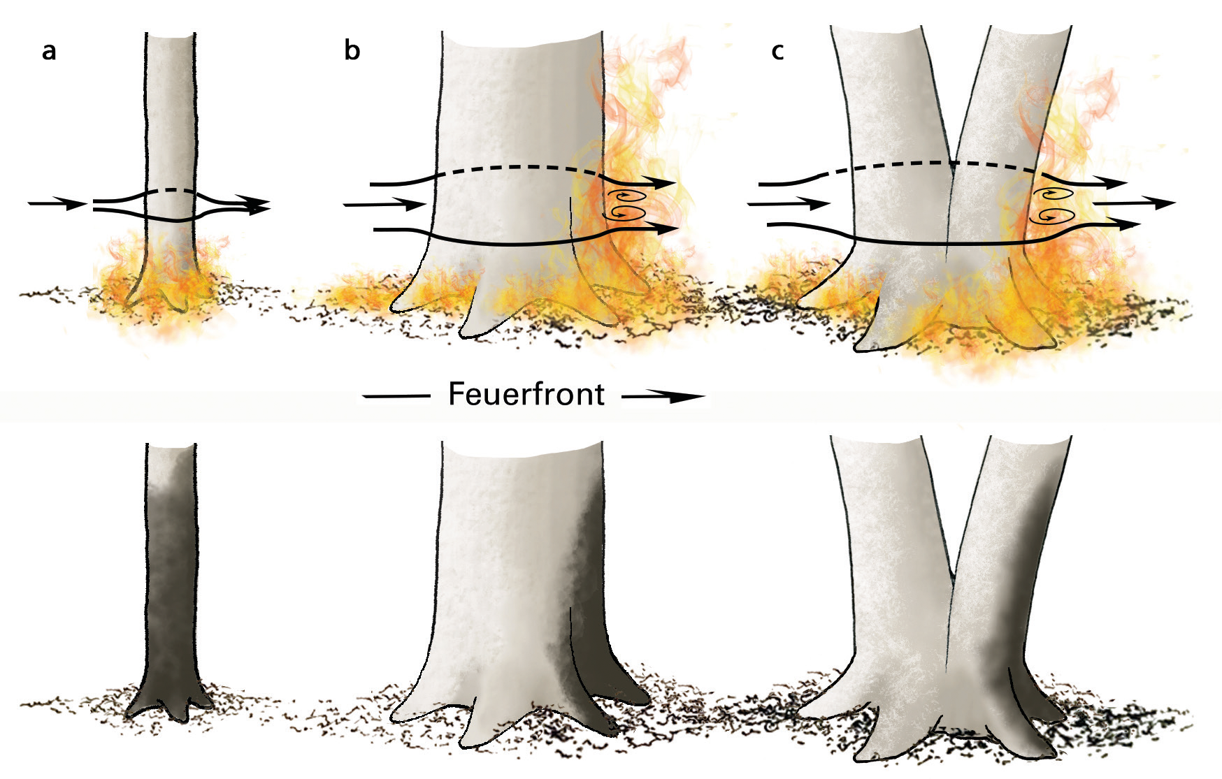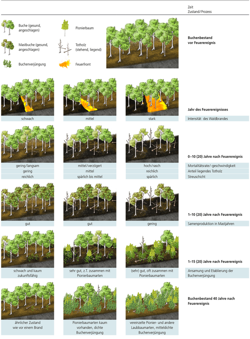 Wie rasch Buchen nach einem Waldbrand absterben bzw. ob sie diesen überleben, ergibt sich aus der Interaktion zwischen Brandintensität und individuellen morphologischen Eigenschaften (Abb. 2; bspw. Brusthöhendurchmesser) sowie der Wahrscheinlichkeit sekundären Pilzbefalls. Je dicker der Stamm und je geringer die Brandintensität, desto höher ist generell die Überlebenswahrscheinlichkeit. Holzzersetzende Pilze können freiliegendes Holz brandverletzter Buchen befallen und das Mortalitätsrisiko erhöhen. Nach schweren Bränden stirbt der überwiegende Teil der von Feuer geschädigten Buchen innerhalb der ersten zehn Jahre ab. Bei geringen und mittelschweren Bränden dauert der Absterbeprozess 15 bis 20 Jahre.