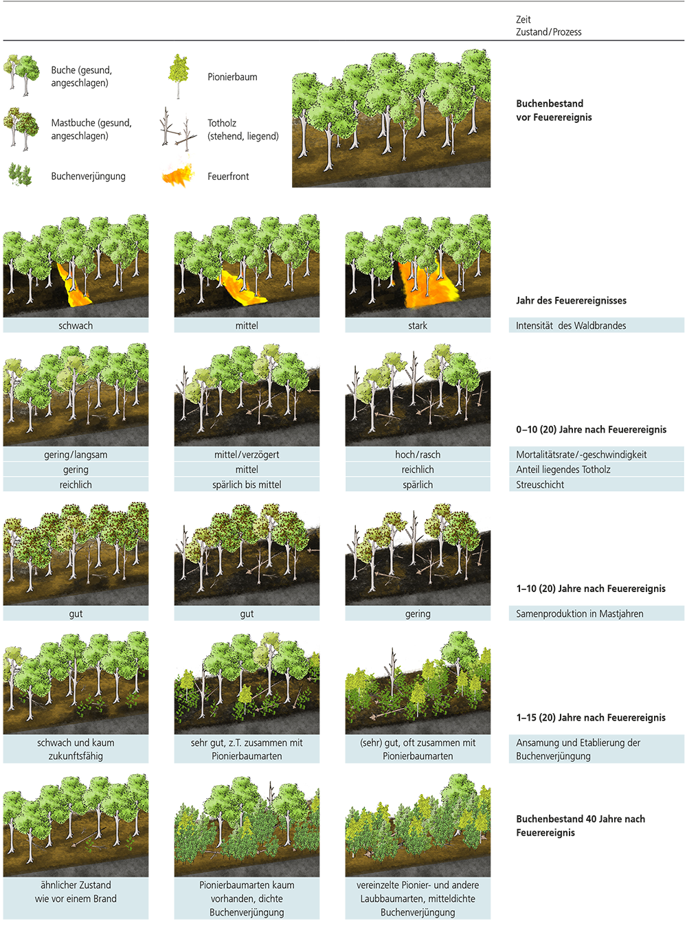 Abb. 4. Schematische Darstellung der Bestandesdynamik in unterschiedlich stark brandgeschädigten Buchenwäldern. Illustrationen: Silvana Wölfle