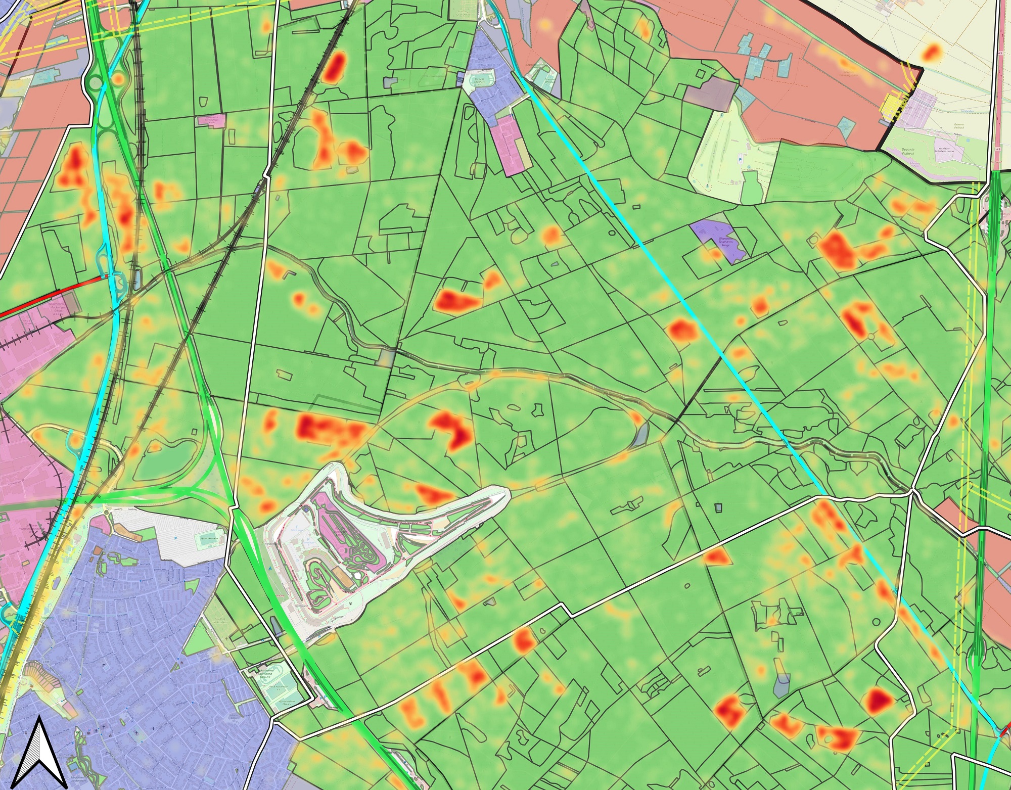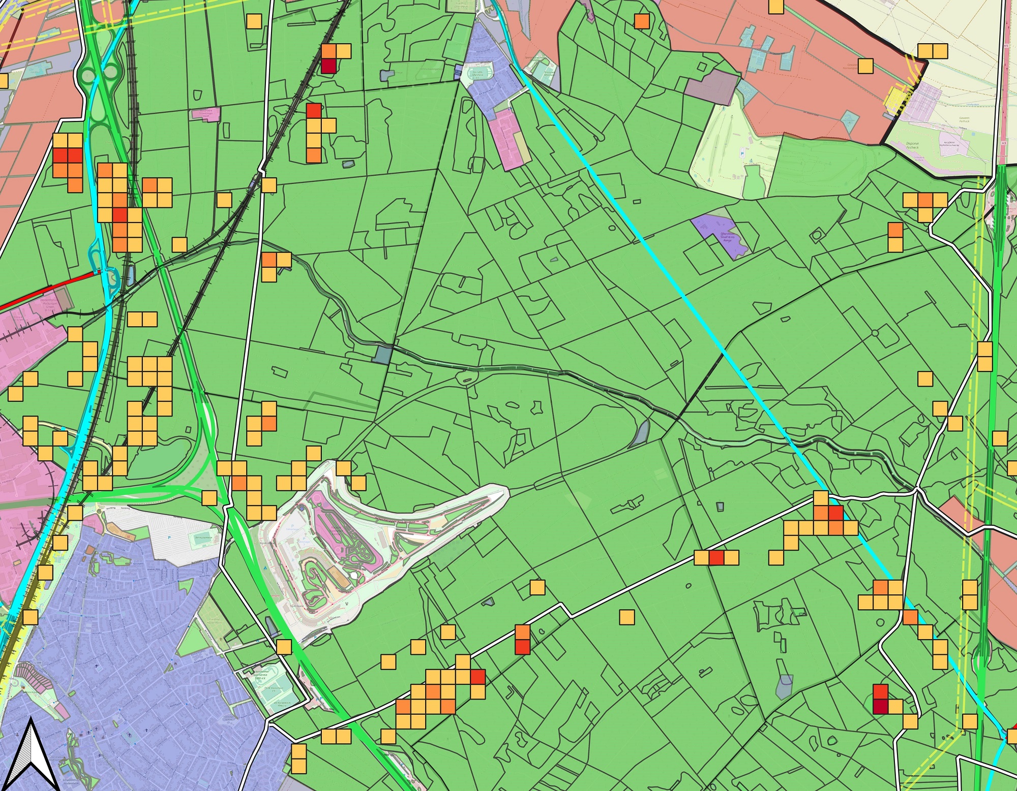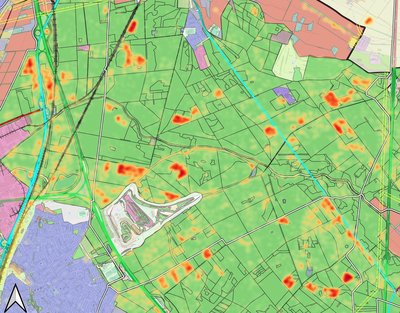 Durch die Verschneidung von Höhenstruktur- und Baumartenmischungskarten ließen sich zum einen Flächen mit intensiverem Brandverhalten identifizieren. Für Einsatzkräfte sind solche Flächen in der Feuerbekämpfung von besonderem Interesse, da sie hier mit einem dynamischeren Brandverhalten konfrontiert sein könnten. Abbildung 2 zeigt das Aufkommen solcher Flächen in Form einer sogenannten Heatmap.