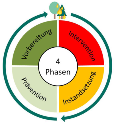 Der Krisenmanagementzyklus bietet eine bewährte und effektive Möglichkeit des Managements für einen umfassenden Ansatz. Der Fokus liegt hier auf der Prävention und Vorbereitung, vor dem Eintreten eines Waldbrands. Wenn diese gestärkt sind, kann das Management effektiver werden.