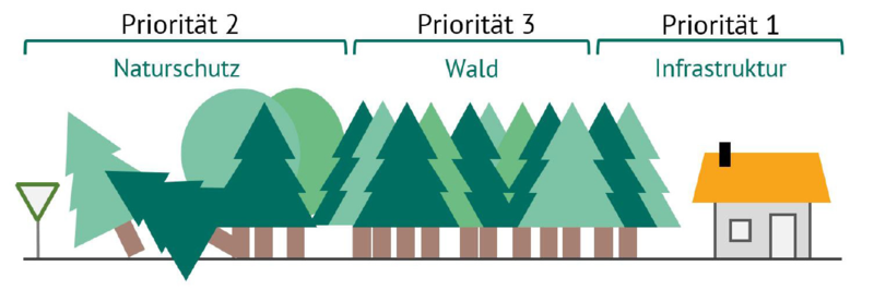 2. Absprache mit Akteuren zu schützenswerten Objekten, dem Schutzgut. Hieraus lässt sich eine Priorisierung der Maßnahmen ableiten. Wichtig hierbei: Wald kann, muss aber keine hohe Priorität haben. Der Fokus liegt oft auf wichtiger Infrastruktur und Ökosystemleistungen im und am Wald (z. B. Wohnsiedlungen, Autobahn, aber auch Naturschutzflächen und anderen Waldfunktionen).