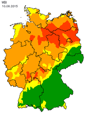 Abb. 1: Kartografische Darstellung des bundesweiten Waldbrandgefahrenindex (WBI) für den 10. Juni 2015 (Quelle DWD).