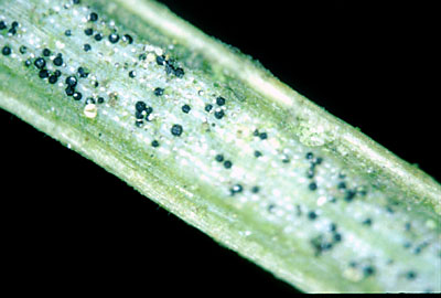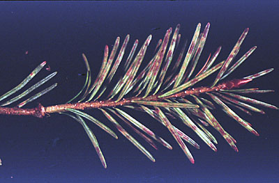 Die kleinen schwarzen Pünktchen der Pilzfruchtkörper, die aus den Spaltöffnungen infizierter Nadeln hervorbrechen, verschaffen ihnen einen entsprechend graues Aussehen (Abb. 1). Die Entwicklungszeit der Pilze beträgt nach Butin (1996) zwei bis drei Jahre, so dass selbst stark befallene Bäume immer mindestens zwei komplette Nadeljahrgänge besitzen müssten.