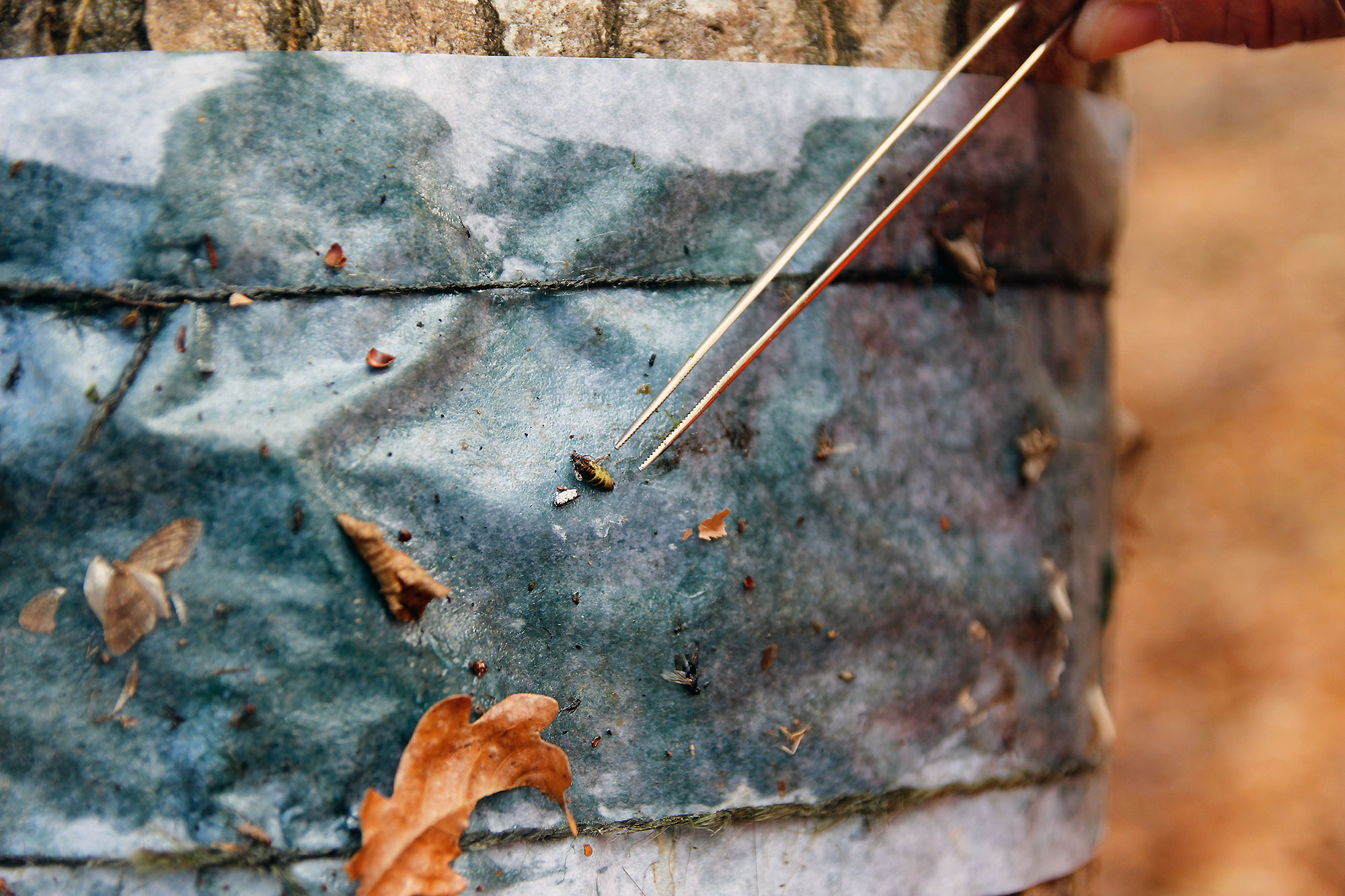 Die in den letzten Jahren vergleichsweise geringe Belastung der Eiche durch Schadorganismen wird in diesem Jahr zumindest regional voraussichtlich ein Ende haben. Denn die Befunde des landesweiten Frostspanner-Monitorings zeigen in der Oberrheinebene Werte auf, die deutlich über den kritischen Dichten für zu erwartenden Kahlfraß liegen. Dies setzt voraus, dass die frisch geschlüpften Raupen im Frühjahr auf junges Eichenlaub treffen. Bei dem Monitoring werden die im Winter auf Leimringen gefangenen Weibchen gezählt (Abb. 10). Nach Kahlfraß und zu befürchtendem Mehltaubefall der nachfolgenden Regenerationstriebe kann sich deshalb wieder die Symptomatik einer in diesem Zusammenhang entstehenden akuten oder auch chronischen Eichenerkrankung einstellen. Erfahrungsgemäß steht dies unter anderem in Verbindung mit dem Auftreten des Zweipunktigen Eichenprachtkäfers und des Hallimaschs.