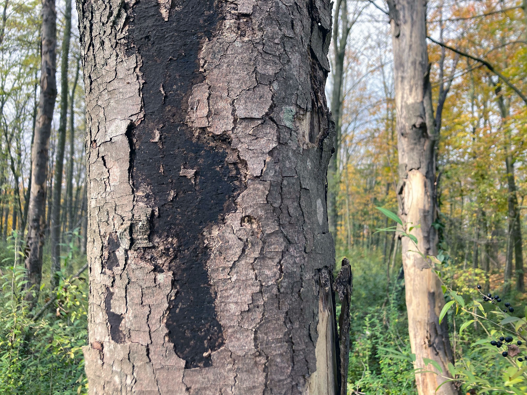 Das Eschentriebsterben ist auf rund 4.500 ha noch weit verbreitet. Die im Umfang der gemeldeten Flächen festgestellte Abnahme kann auch darauf zurückgeführt werden, dass die Verbreitung der Esche mittlerweile zurückgegangen ist. In den betroffenen Beständen sind oft Stammfußnekrosen und Befall durch Hallimasch vorzufinden. Daraus resultiert eine rasche Stockfäule und Bruchgefährdung. Die Ahorn-Rußrindenkrankheit wurde auf rund 100 ha gemeldet (Abb. 12). Vor allem für den Berg-Ahorn bleibt die Belastung nach der sommerlichen Dürreperiode in 2022 durch diese Krankheit auf anhaltend hohem Niveau.