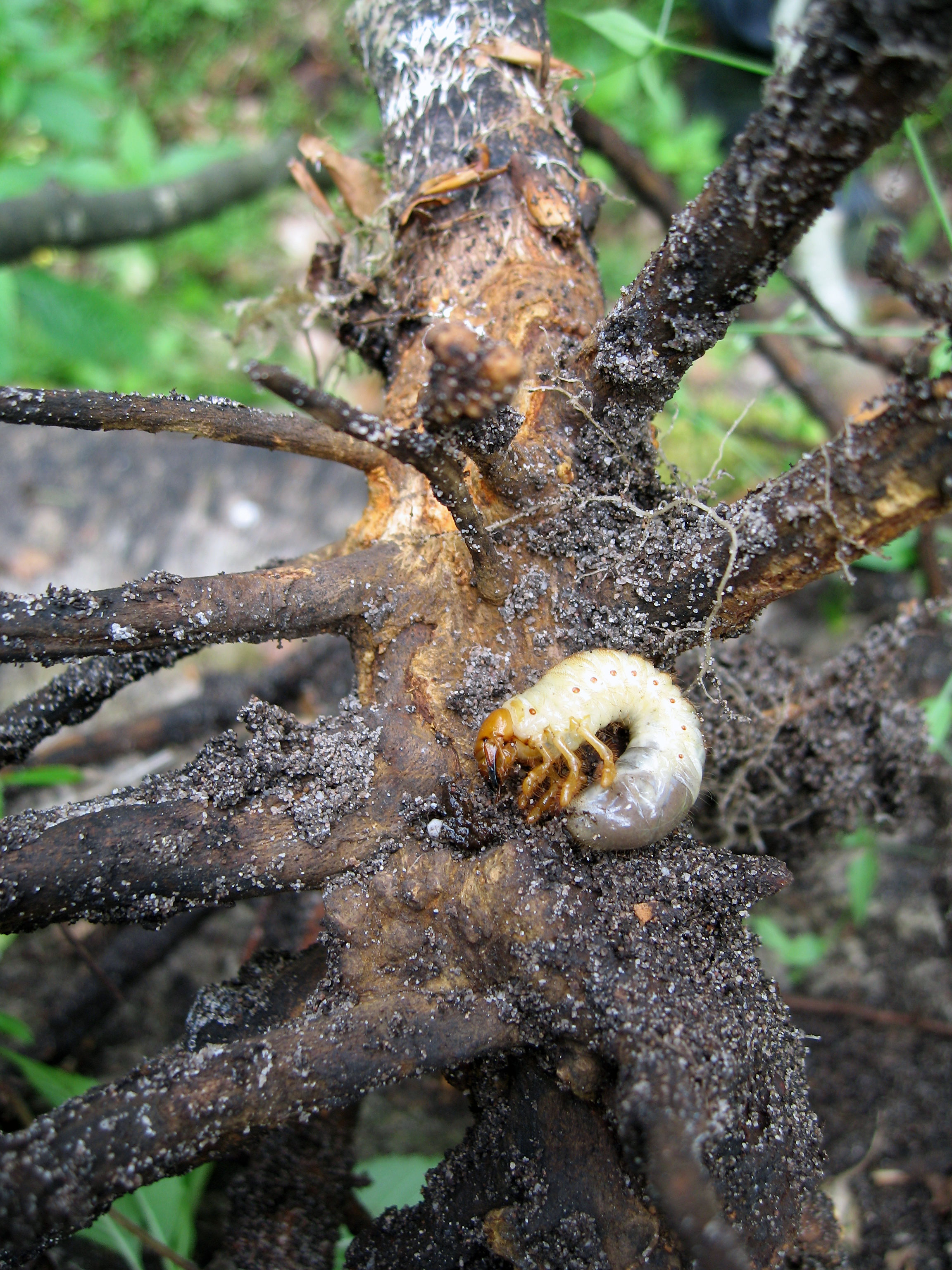 Der Maikäfer schränkt das Potenzial für Waldverjüngung in der Oberrheinebene vielerorts erheblich ein. Das liegt am Wurzelfraß seiner Engerlinge, wovon besonders Jungwüchse und unterständige Bäume betroffen sind (Abb. 13). Aber auch die Vitalität von Baumhölzern wird durch Wurzelverluste ungünstig beeinträchtigt. Insgesamt ist eine Fläche von rund 31.000 ha mit einem Schwerpunkt in den Hardtwäldern betroffen. Darüber hinaus gibt es aber auch in Wäldern nördlich des Kaiserstuhls ein nennenswertes Vorkommen. Im Frühjahr 2023 wird vor allem im Verbreitungsgebiet des sogenannten Südstamms zwischen Raststatt und Bruchsal auf rund 13.000 ha der an warmen Abenden eindrucksvolle Schwärmflug der adulten Maikäfer stattfinden.