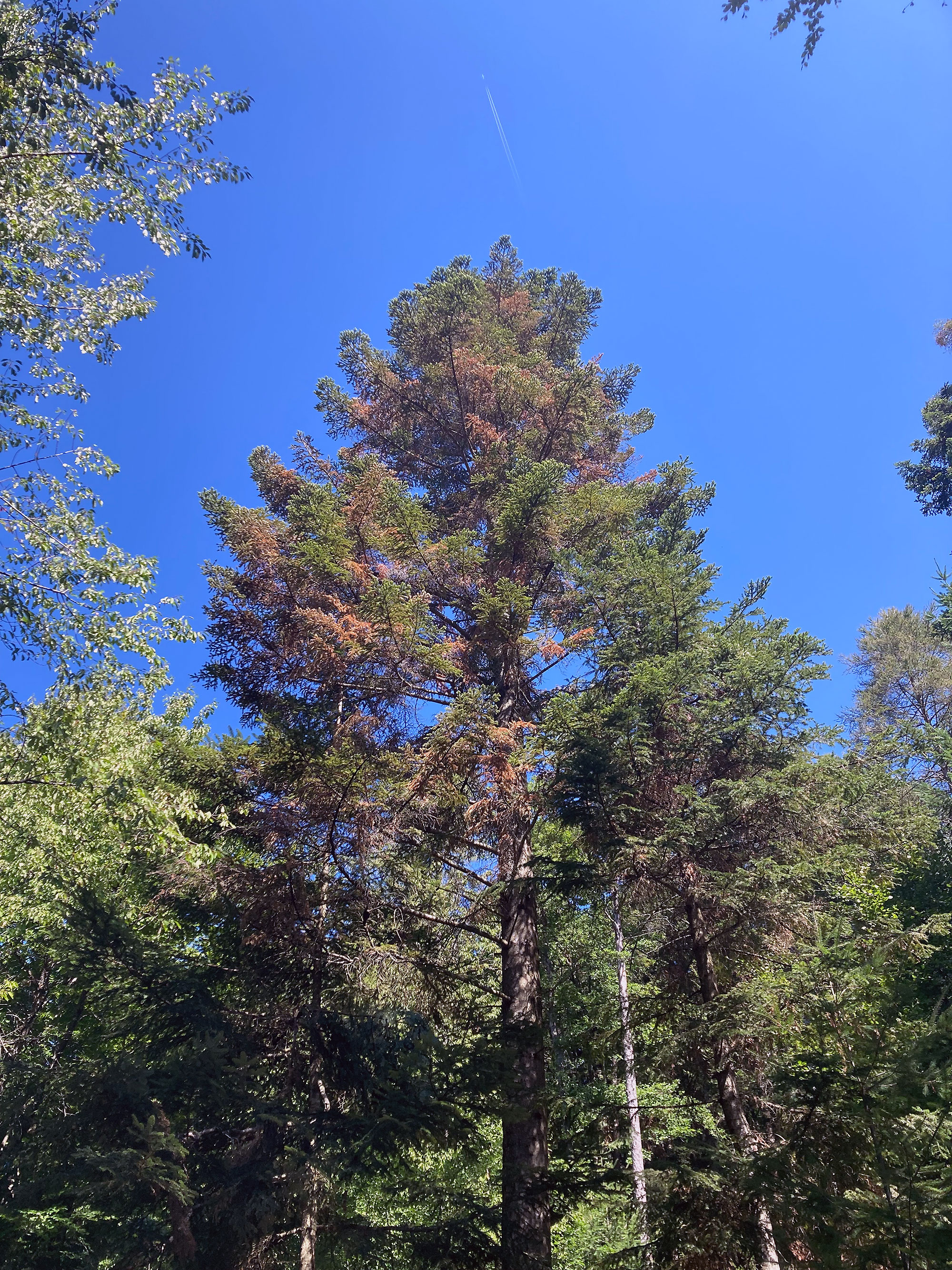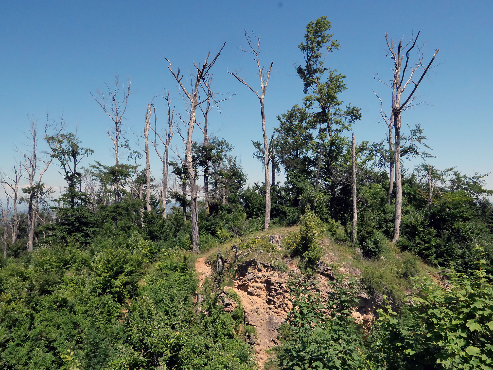 Nach wie vor zeigt die Douglasie örtlich auffällig schüttere Kronen, die mit markanten Vitalitätsverlusten bis hin zur Mortalität verbunden sein können. In diesem Zusammenhang sind oft der Rußige Schüttepilz oder die Douglasien-Gallmücke beteiligt. Auf ohnehin trockenen Standorten setzt der Douglasie die Dürre besonders zu, die auch ohne Beteiligung weiterer Schadfaktoren direkt zum Absterben führen kann. Außerdem werden an der vor mehr als hundert Jahren aus Nordamerika eingeführten Douglasie bei rotverfärbten Kronen in den letzten trocken-warmen Jahren zunehmend häufiger europäische Borkenkäferarten vorgefunden. Bisher sind daran im wesentlichen Kupferstecher, Furchenflügeliger Fichtenborkenkäfer und der Westliche Tannenborkenkäfer beteiligt. Zur Sicherheit ist auch hier eine zeitnahe Sanierung dieser Bäume zu empfehlen.
