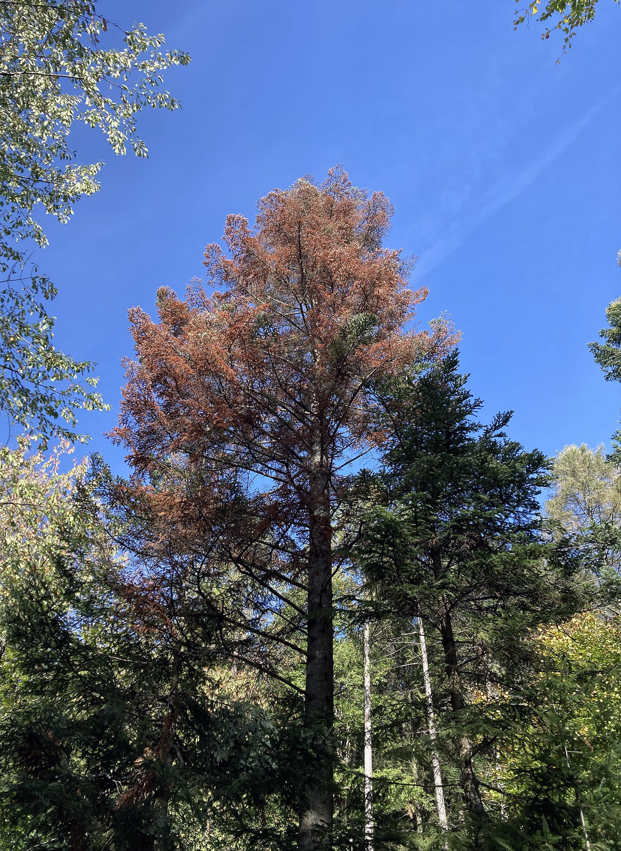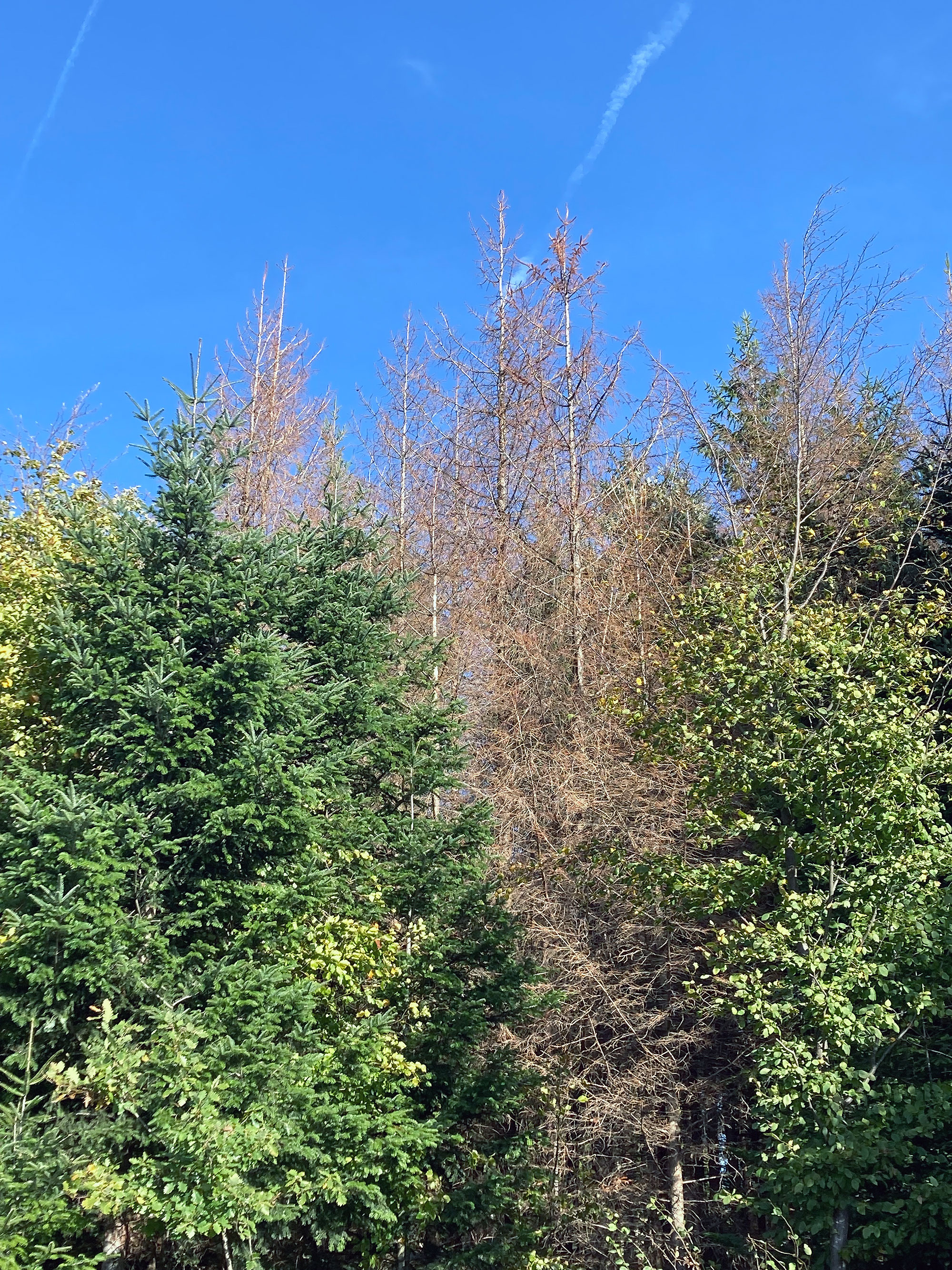 Der Gesundheitszustand der Tannen hat in den letzten Dürrejahren vor allem in sub- bis mittelmontanen Höhenstufen bis etwa 800 m ü.NN besonders auf flachgründigen und sonnenexponierten Lagen in den Vorbergzonen des Schwarzwaldes, im Neckarland, am Bodensee und in Teilen der Schwäbischen Alb sehr gelitten (Abb. Karte 3b). So werden infolge der Dürre 2022 seit letztem Herbst wieder zahlreiche rot zeichnende Tannen beobachtet (Abb. 4). Oftmals geht damit Insektenbefall einher, welcher vorgeschwächte Tannen verstärkt zum Absterben bringt. Daran sind verschiedene Tannenborkenkäferarten und Tannenrüssler beteiligt. Zudem wirkt sich intensiver Mistelbefall bei Trockenstress deutlich stärker auf die Vitalität der Tannen aus und kann dadurch das Schadgeschehen verstärken.