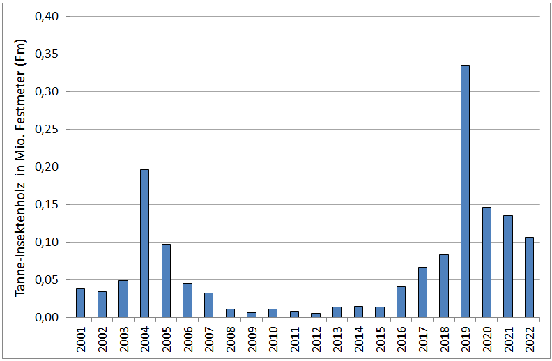Dies lässt befürchten, dass die Schadholzmengen bei der Tanne ähnlich wie nach den Trockenjahren 2003 und 2018 in diesem Jahr wieder ansteigen. Dies steht im Einklang mit Berichten aus dem benachbarten französischen Jura und den Vogesen in der Region Burgund-Franche-Comté (s. Bericht auf Französisch). Während die insektenbedingt angefallene Holzmenge mit 0,11 Mio. Fm in Baden-Württemberg über das ganze Jahr gesehen noch rückläufig war (Abb. 5), ist die bis November 2022 zum Borkenkäfer gemeldete Schadfläche bei der Tanne wieder deutlich gestiegen. Auch wenn die Borkenkäfer an Fichte immer noch als gefährlicher eingeschätzt werden müssen (Abb. 3), macht die Entwicklung der letzten zwanzig Jahre sehr deutlich, dass mit den klimatischen Veränderungen auch bei der Tanne künftig bis in hohe Lagen ein ausgereiftes Borkenkäfer-Management notwendig sein wird.